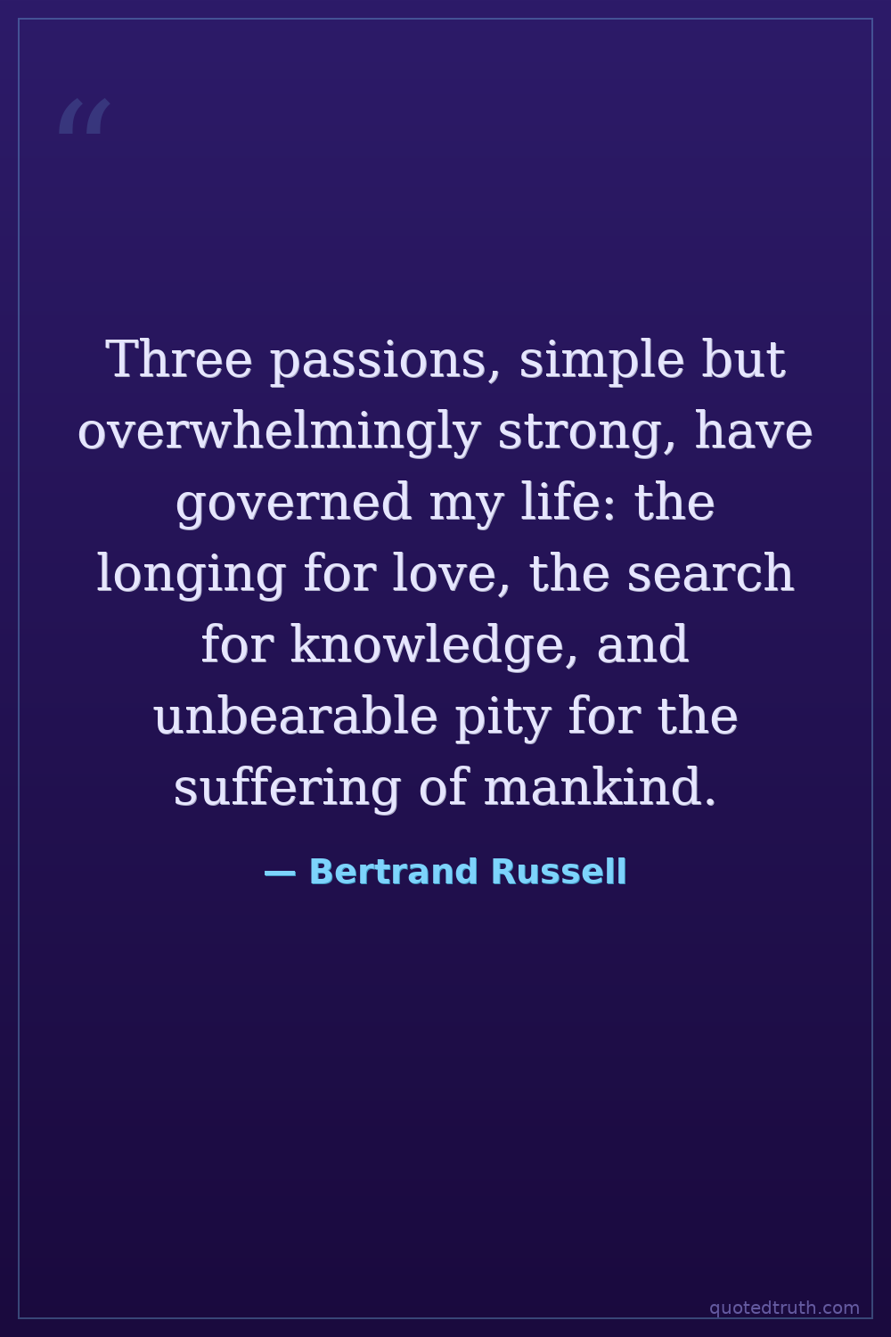 Three passions, simple but overwhelmingly strong, have governed my life: the longing for love, the search for knowledge, and unbearable pity for the suffering of mankind.