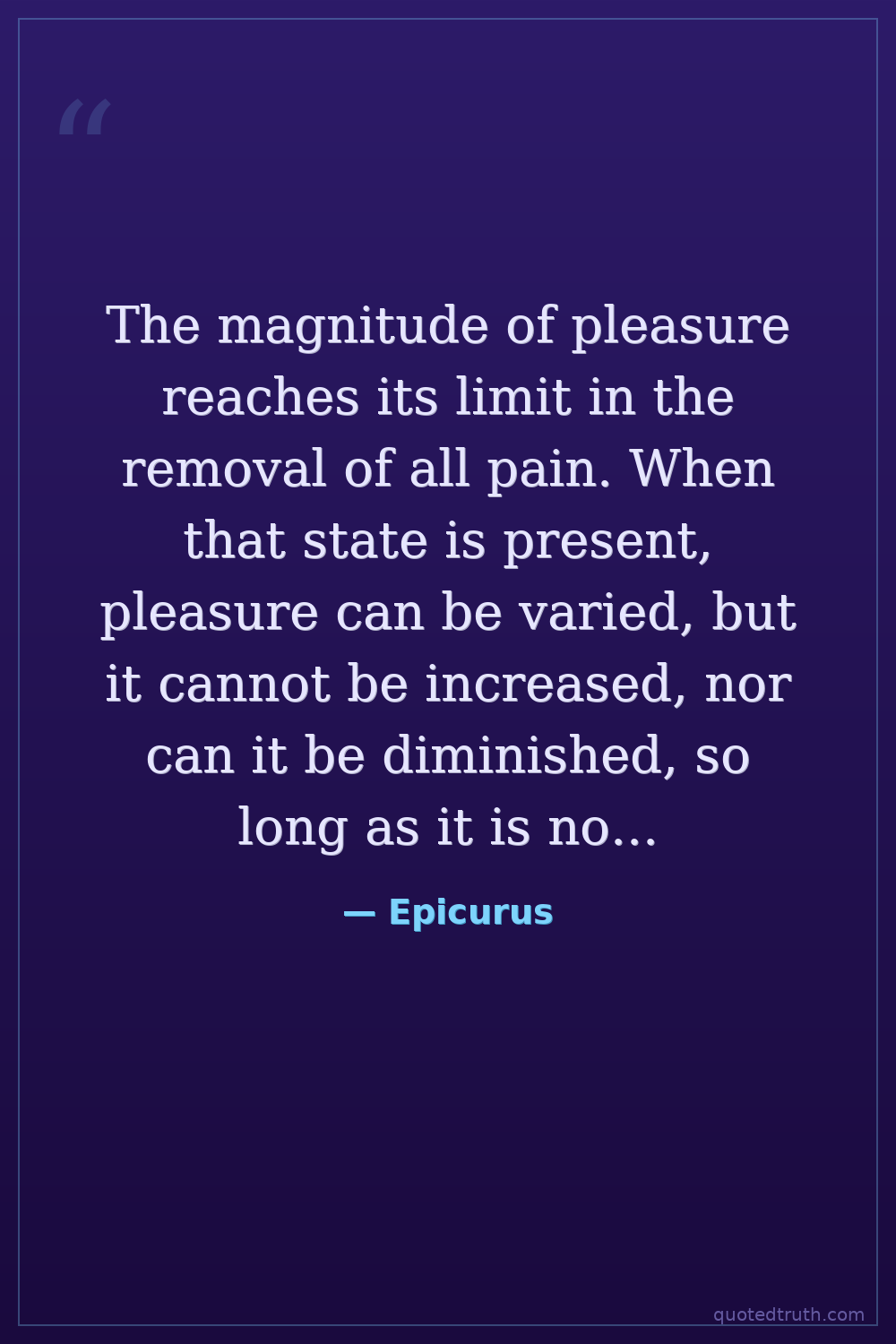 The magnitude of pleasure reaches its limit in the removal of all pain. When that state is present, pleasure can be varied, but it cannot be increased, nor can it be diminished, so long as it is not disturbed by pain.