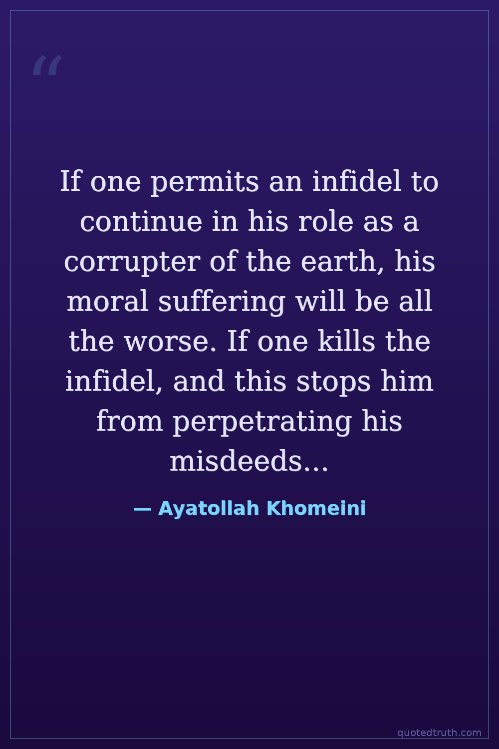 If one permits an infidel to continue in his role as a corrupter of the earth, his moral suffering will be all the worse. If one kills the infidel, and this stops him from perpetrating his misdeeds, his death will be a blessing to him. — Ayatollah Khomeini Contemporary Iranian revolution leader