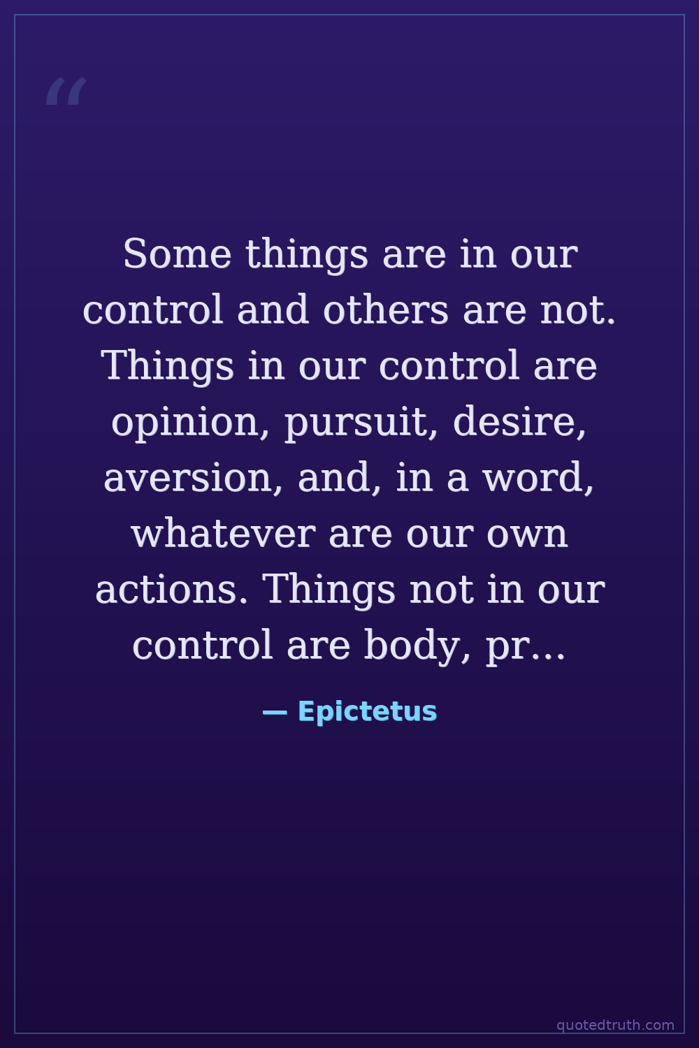 Some things are in our control and others are not. Things in our control are opinion, pursuit, desire, aversion, and, in a word, whatever are our own actions. Things not in our control are body, property, reputation, command, and, in one word, whatever are not our own actions.