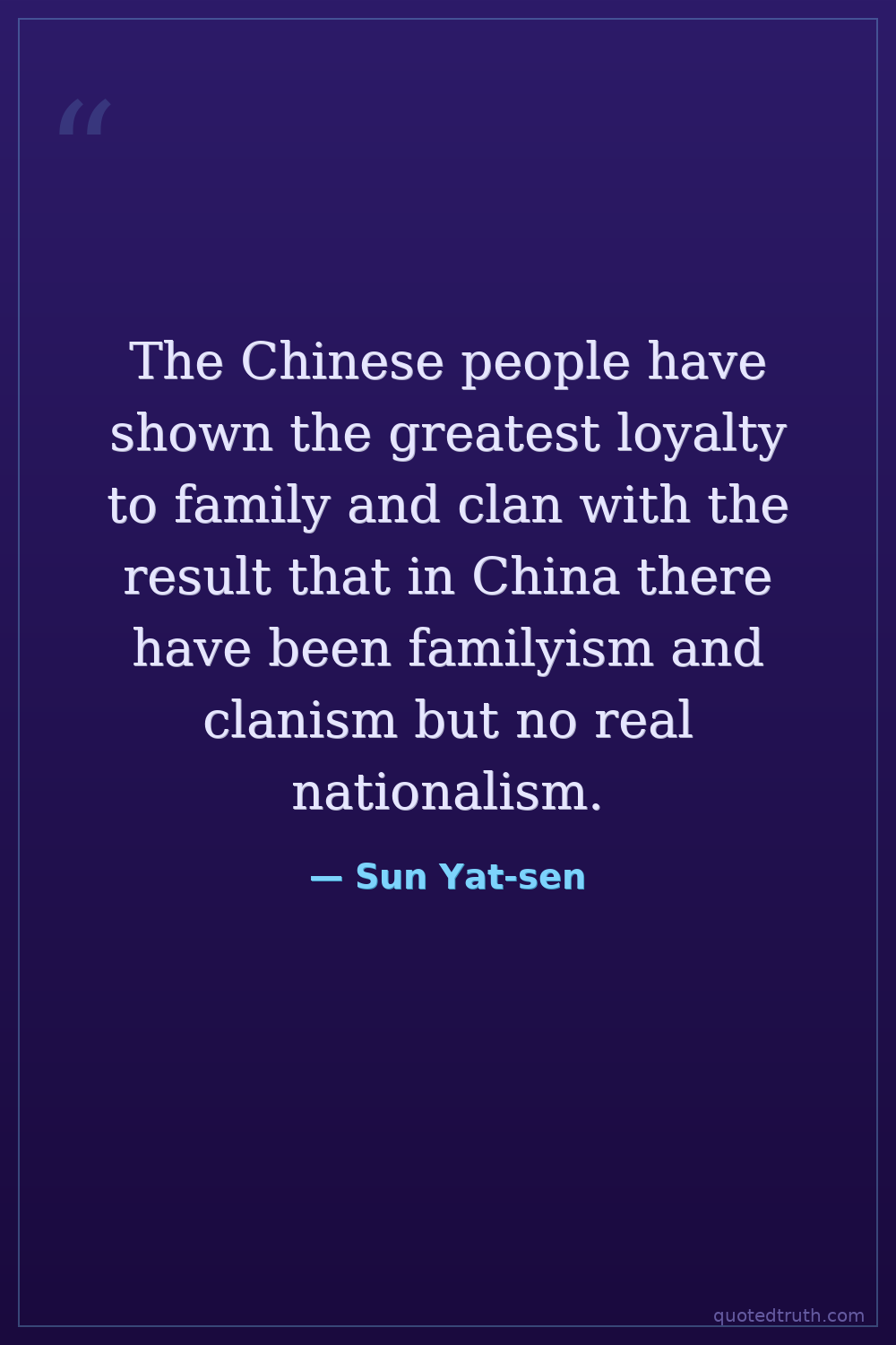 The Chinese people have shown the greatest loyalty to family and clan with the result that in China there have been familyism and clanism but no real nationalism.
