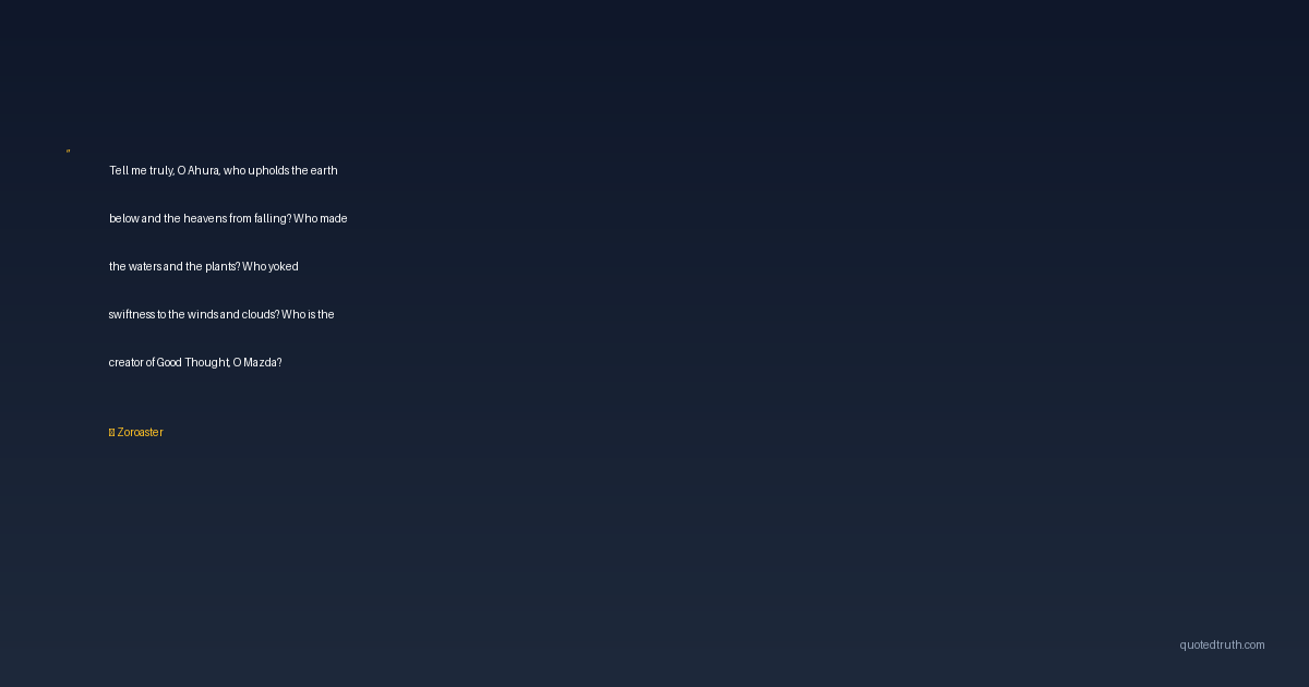 Tell me truly, O Ahura, who upholds the earth below and the heavens from falling? Who made the waters and the plants? Who yoked swiftness to the winds and clouds? Who is the creator of Good Thought, O Mazda?