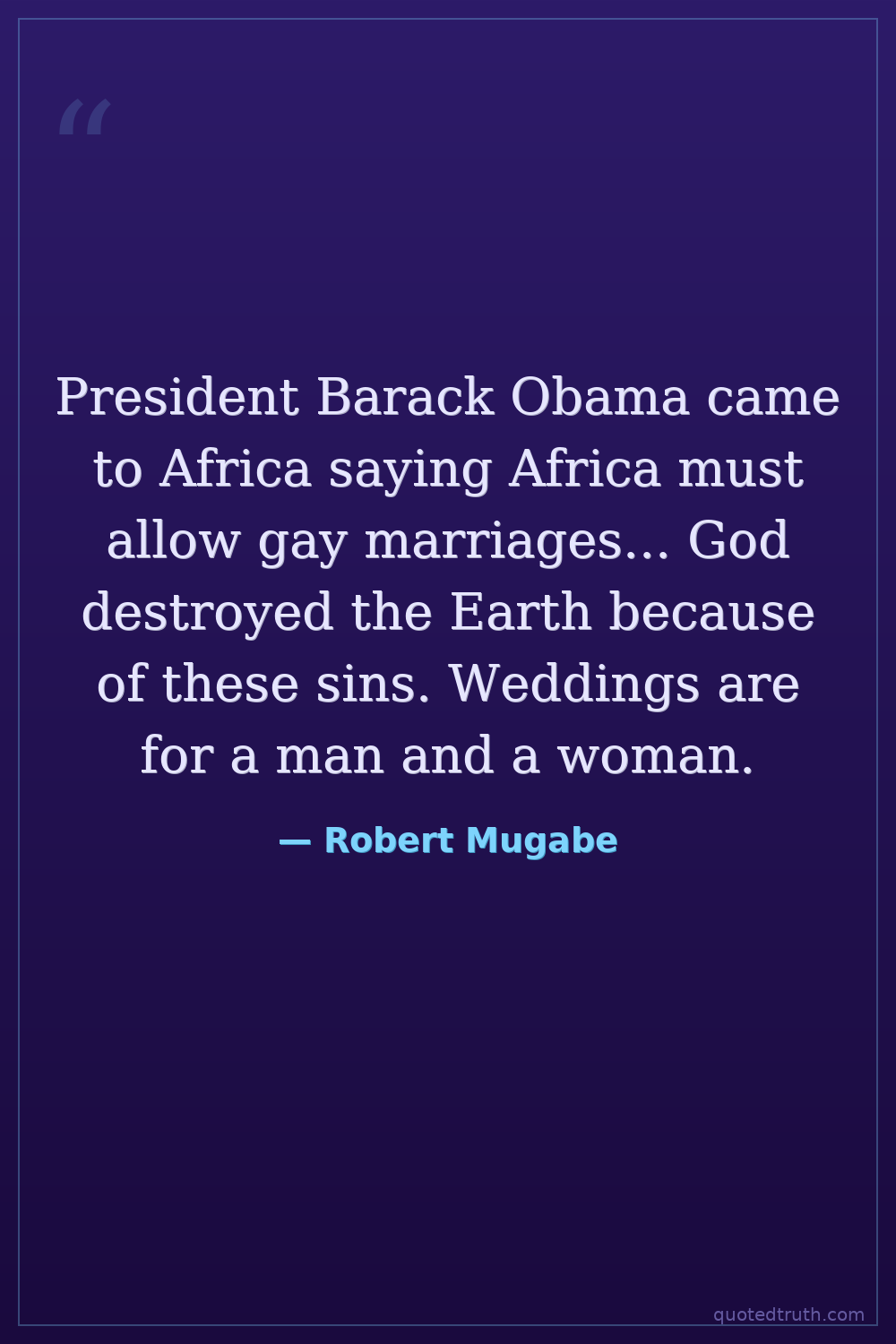 President Barack Obama came to Africa saying Africa must allow gay marriages... God destroyed the Earth because of these sins. Weddings are for a man and a woman.