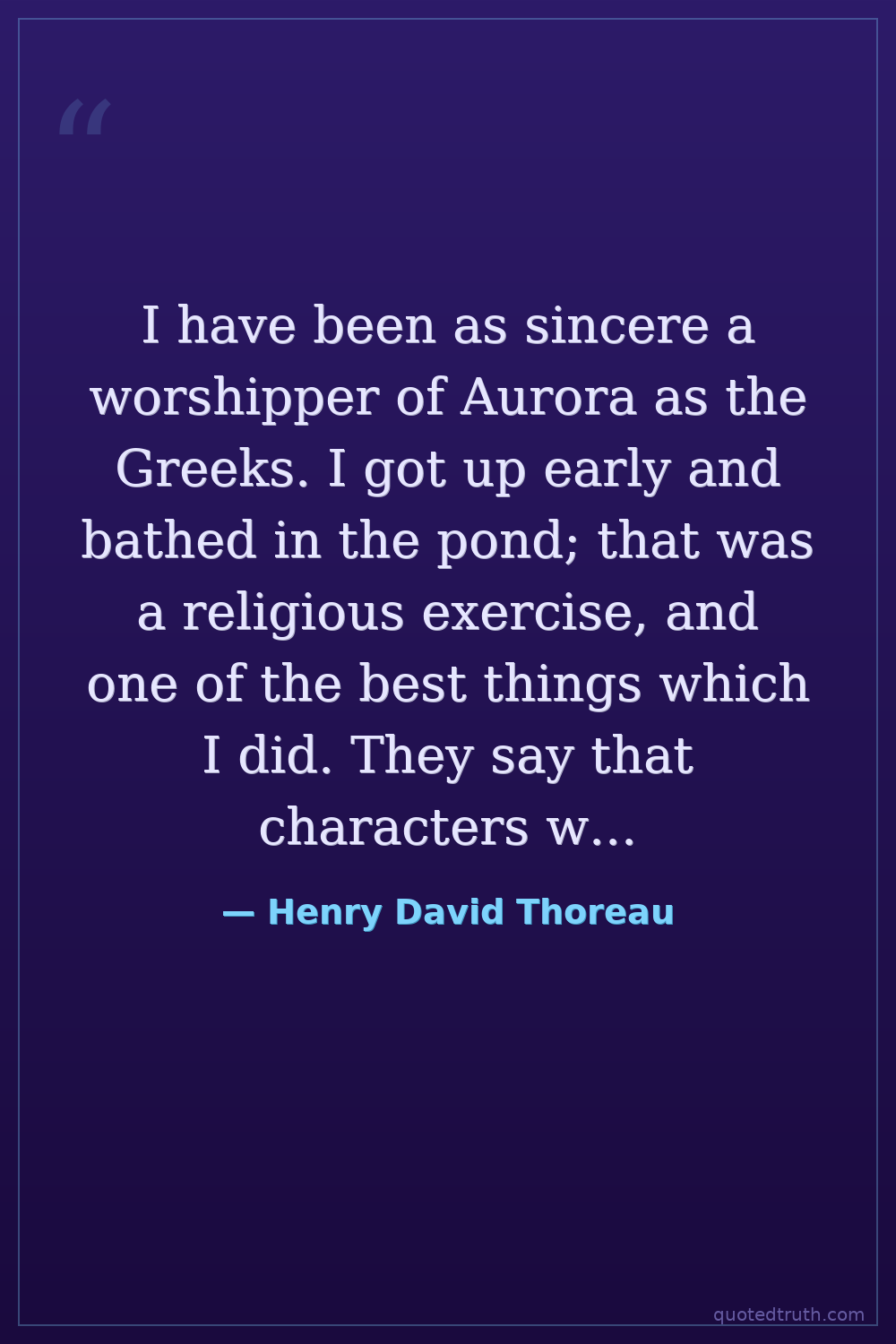 I have been as sincere a worshipper of Aurora as the Greeks. I got up early and bathed in the pond; that was a religious exercise, and one of the best things which I did. They say that characters were engraven on the bathing tub of King Tching-thang to this effect: 'Renew thyself completely each day; do it again, and again, and forever again.'