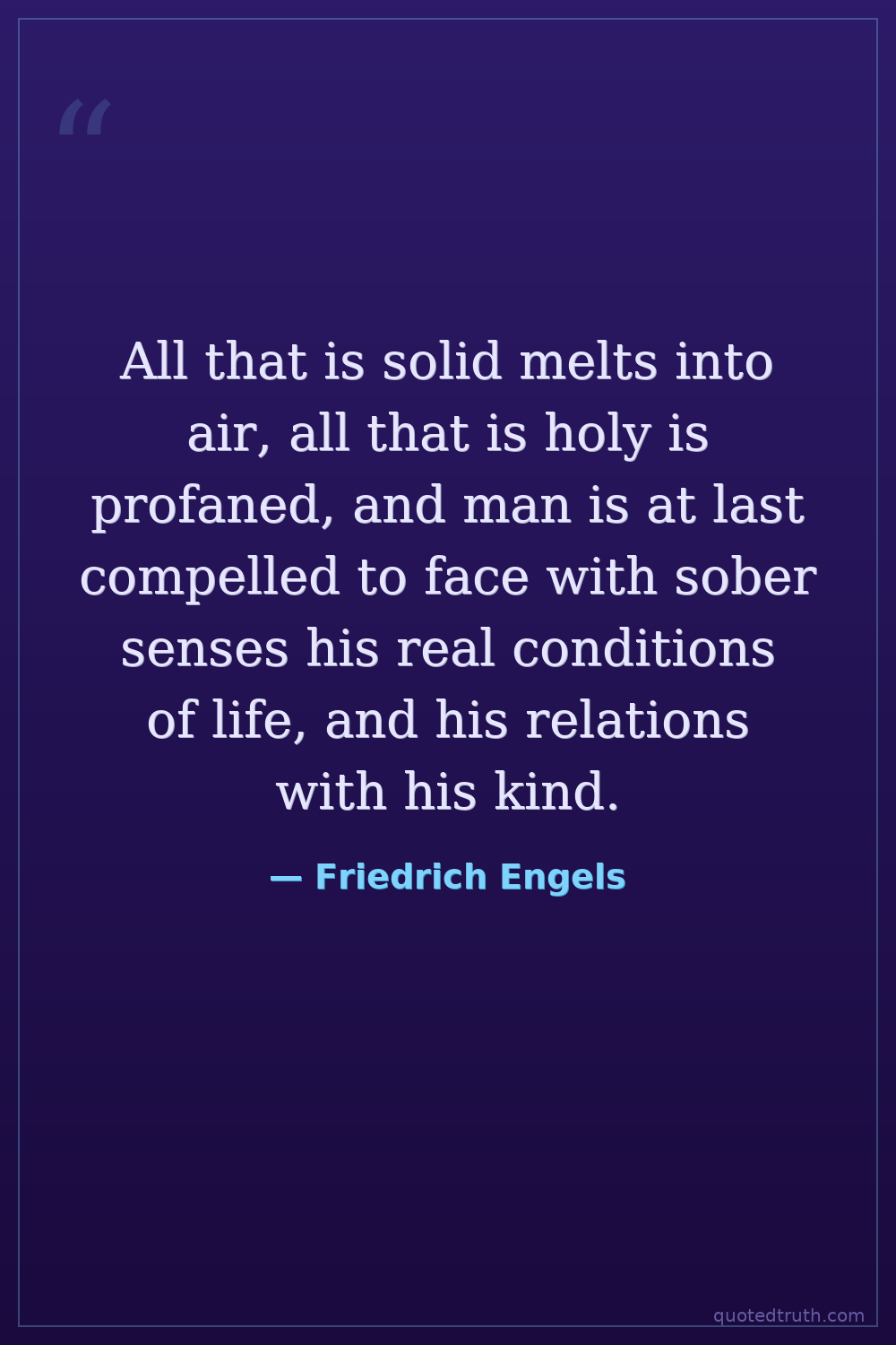 All that is solid melts into air, all that is holy is profaned, and man is at last compelled to face with sober senses his real conditions of life, and his relations with his kind.