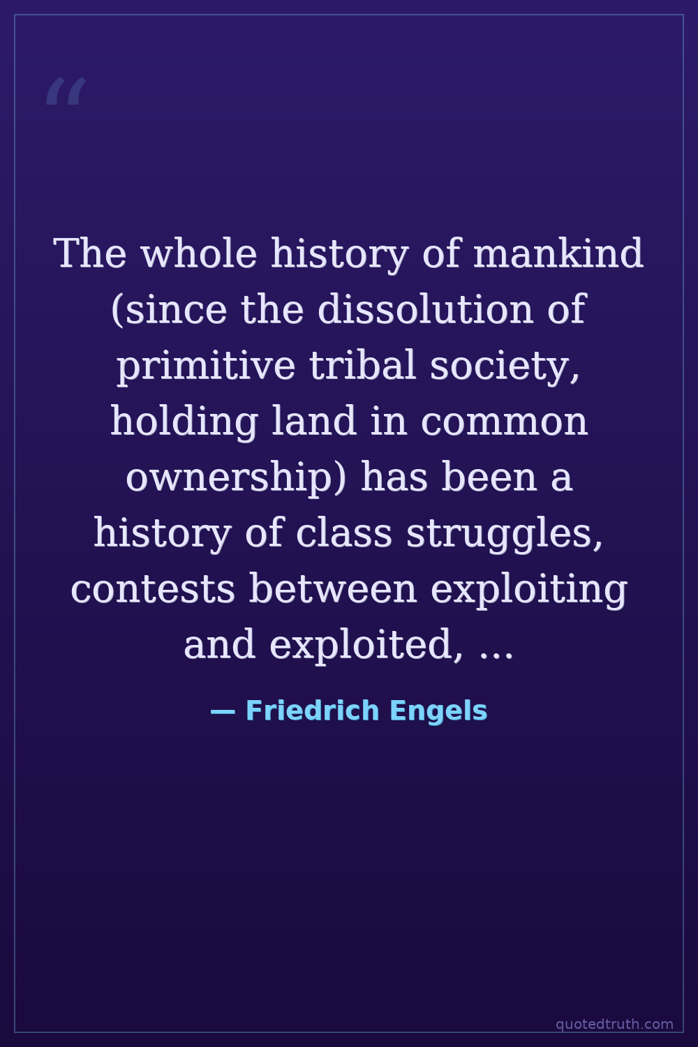 The whole history of mankind (since the dissolution of primitive tribal society, holding land in common ownership) has been a history of class struggles, contests between exploiting and exploited, ruling and oppressed classes. — Friedrich Engels Modern Communist Manifesto co-author