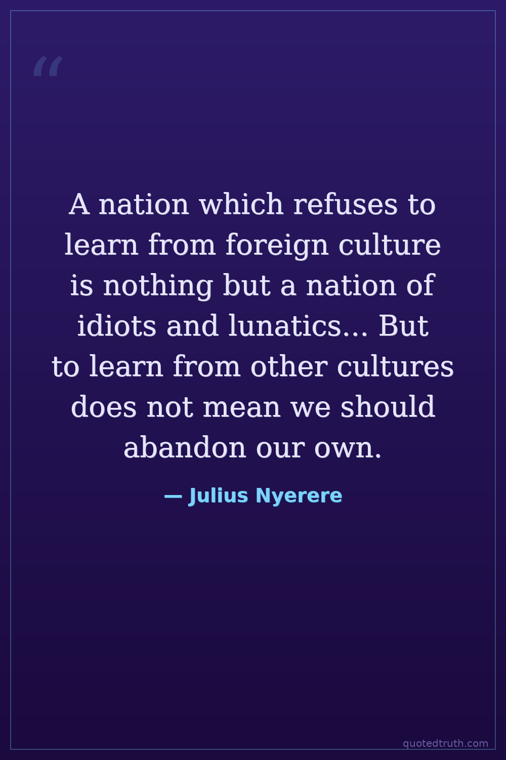 A nation which refuses to learn from foreign culture is nothing but a nation of idiots and lunatics... But to learn from other cultures does not mean we should abandon our own.