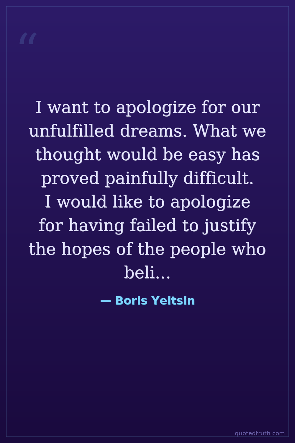 I want to apologize for our unfulfilled dreams. What we thought would be easy has proved painfully difficult. I would like to apologize for having failed to justify the hopes of the people who believed that we would be able to make a leap from the gloomy and stagnant totalitarian past to a bright, prosperous and civilized future at just one go. I myself believed in this. We haven't managed to make this leap, and I was naive in thinking we could.