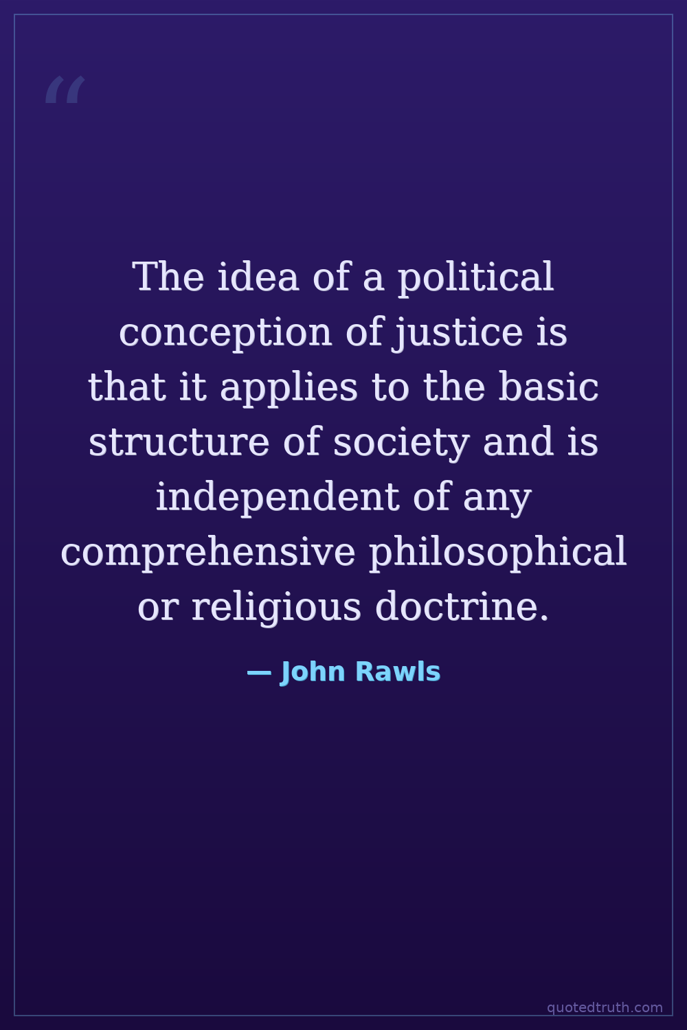The idea of a political conception of justice is that it applies to the basic structure of society and is independent of any comprehensive philosophical or religious doctrine.