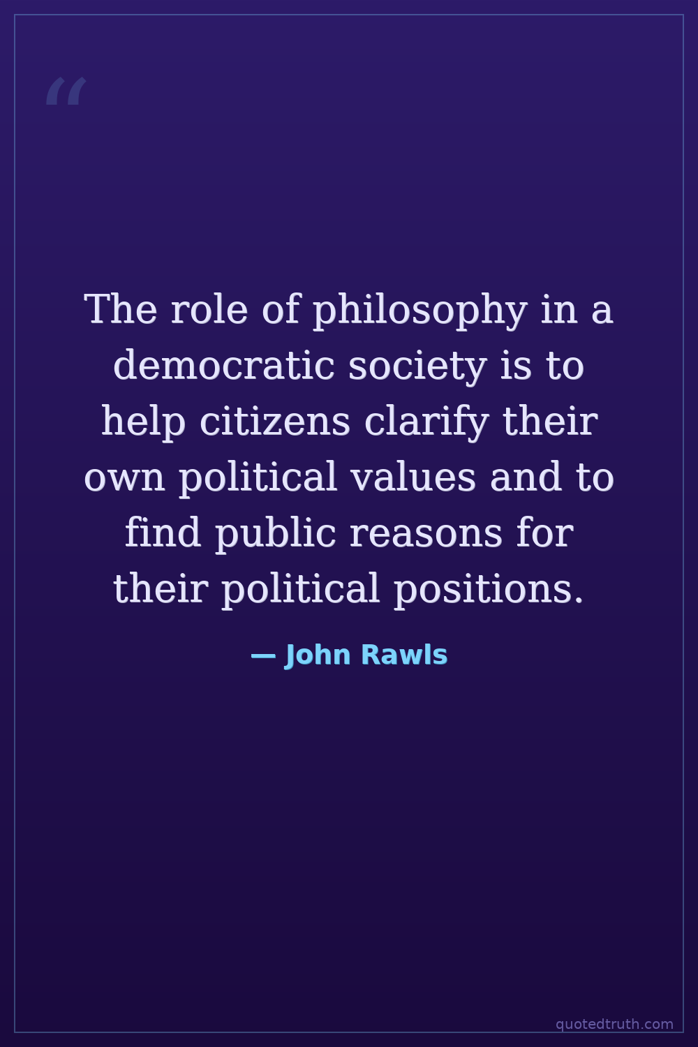 The role of philosophy in a democratic society is to help citizens clarify their own political values and to find public reasons for their political positions.
