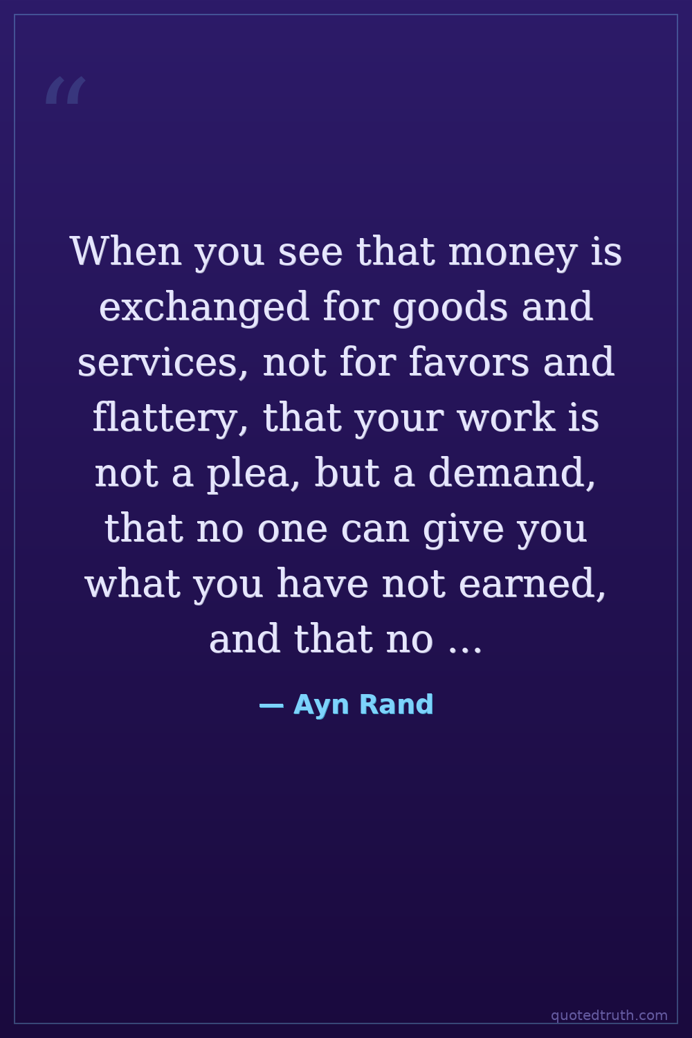 When you see that money is exchanged for goods and services, not for favors and flattery, that your work is not a plea, but a demand, that no one can give you what you have not earned, and that no one can earn for you what you have not given, when you see that the men who get rich by conquest do so by force, and the men who get rich by trade do so by virtue, then you will know that money is the root of all good.