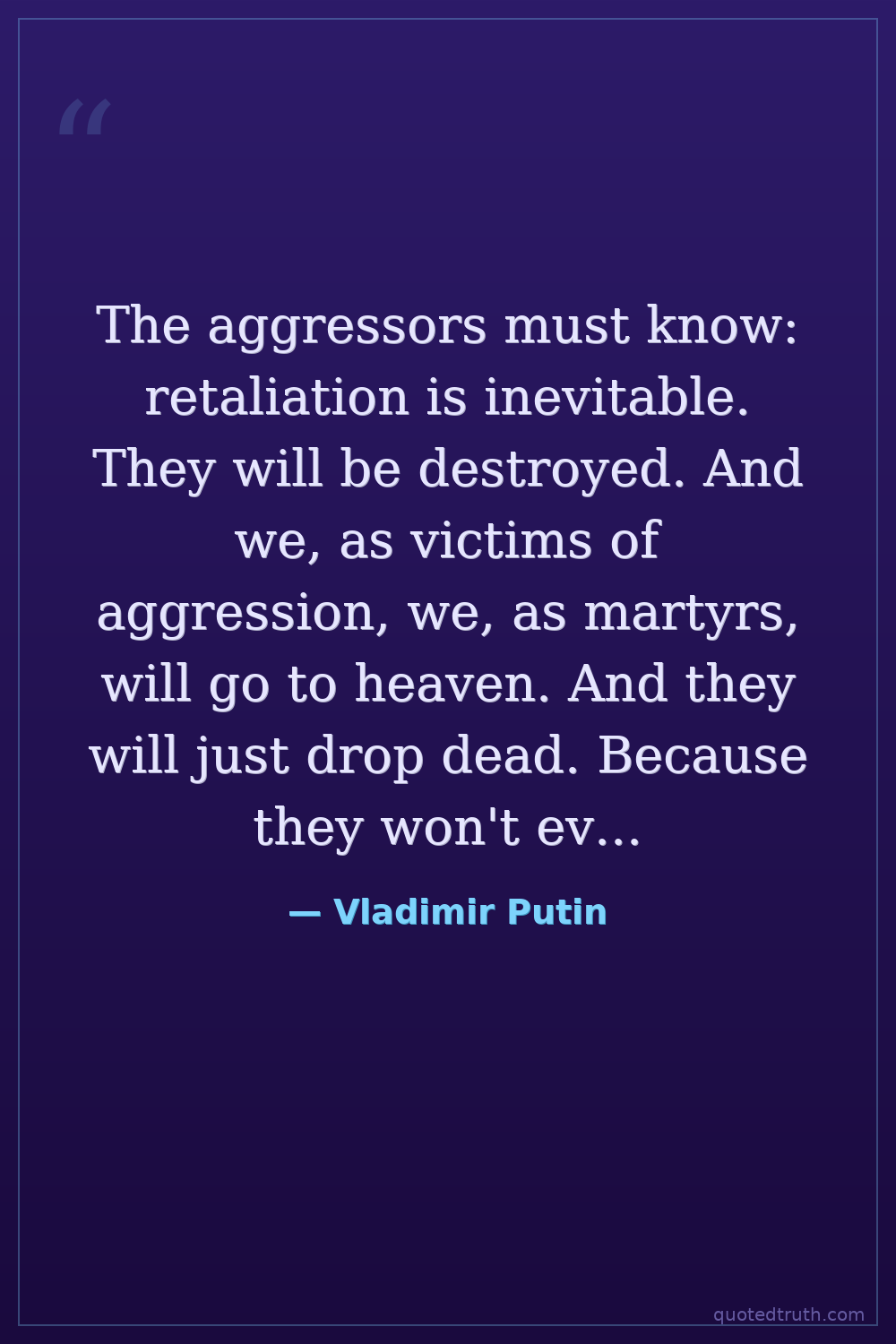 The aggressors must know: retaliation is inevitable. They will be destroyed. And we, as victims of aggression, we, as martyrs, will go to heaven. And they will just drop dead. Because they won't even have time to repent.