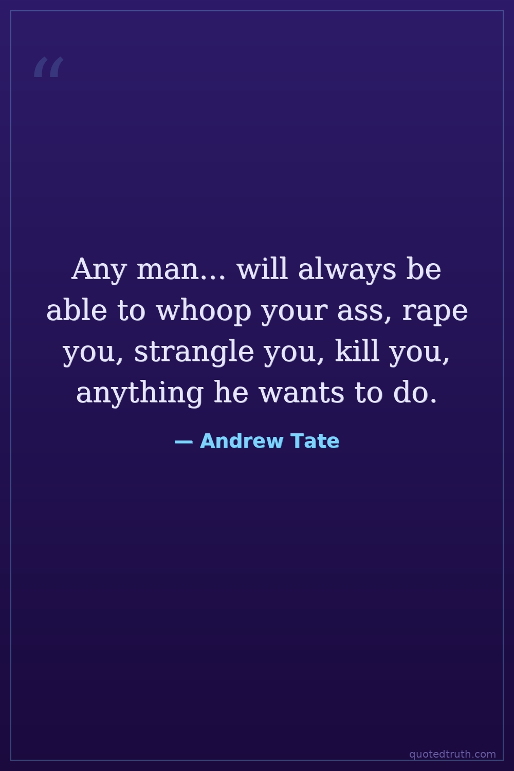Any man... will always be able to whoop your ass, rape you, strangle you, kill you, anything he wants to do.