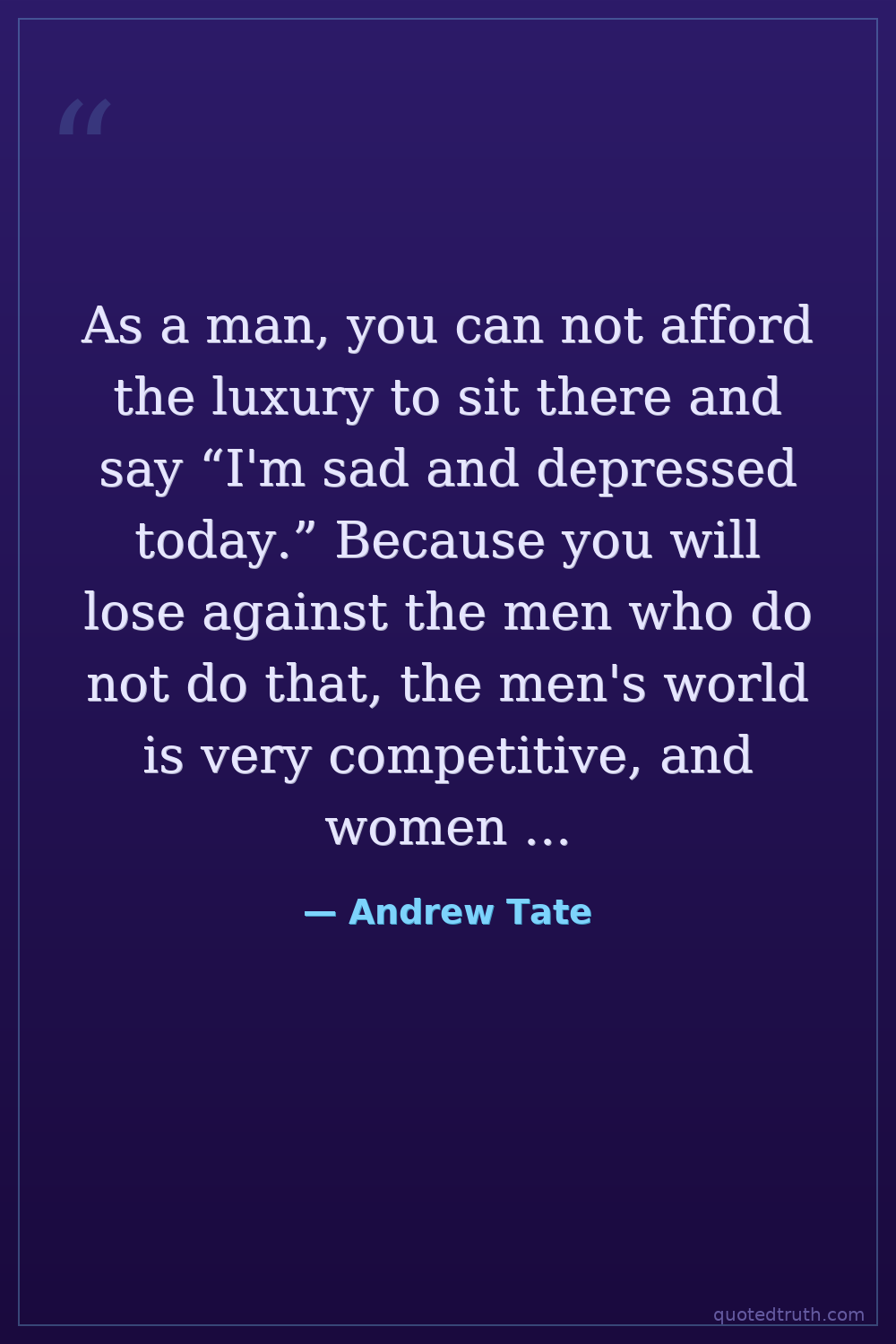 As a man, you can not afford the luxury to sit there and say “I'm sad and depressed today.” Because you will lose against the men who do not do that, the men's world is very competitive, and women only choose the winners.