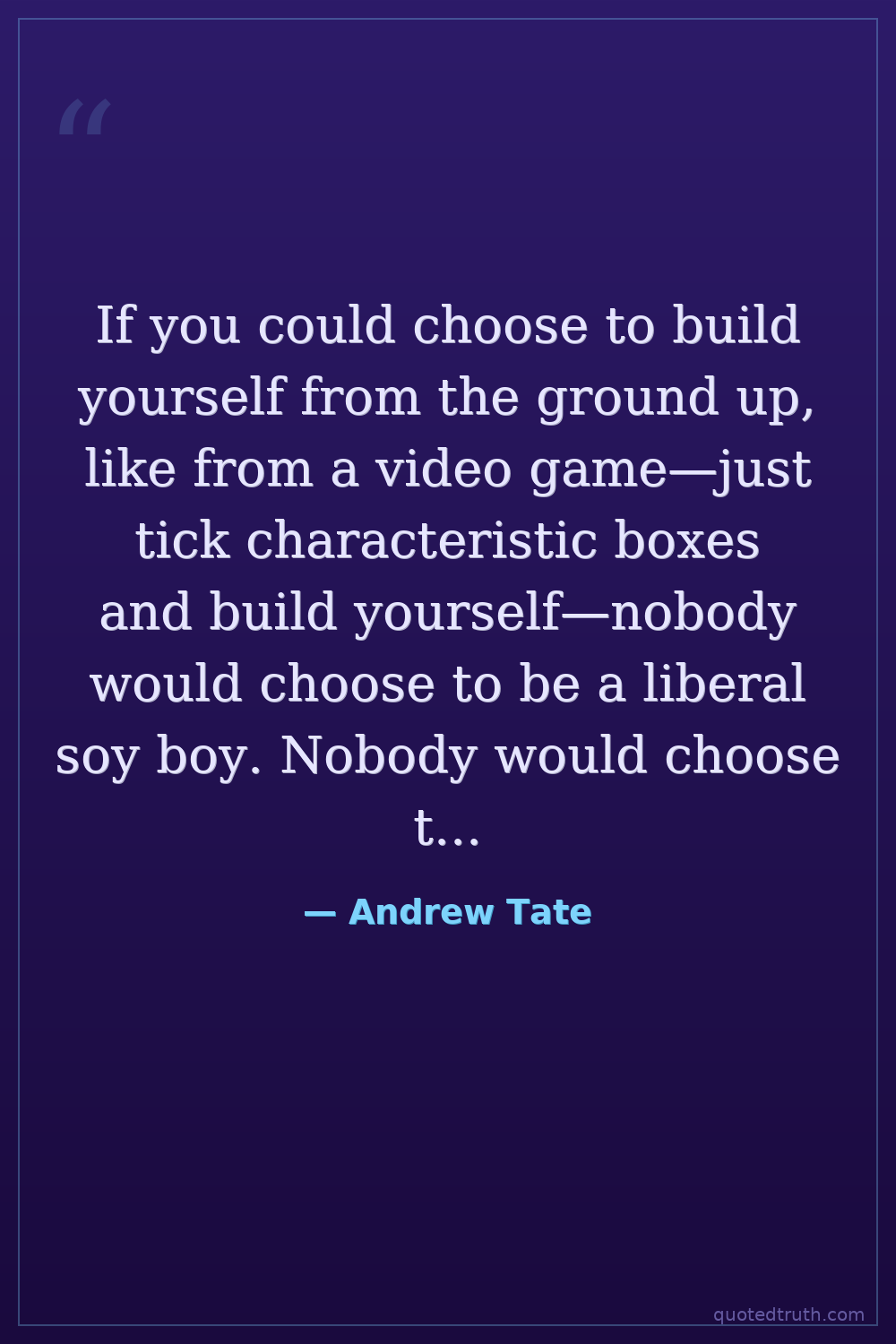 If you could choose to build yourself from the ground up, like from a video game—just tick characteristic boxes and build yourself—nobody would choose to be a liberal soy boy. Nobody would choose to be a small weak guy who has to cry when he gets upset.