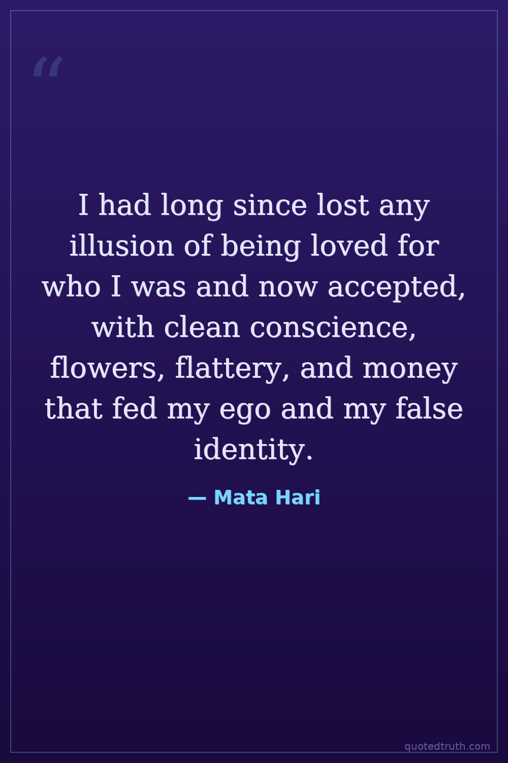 I had long since lost any illusion of being loved for who I was and now accepted, with clean conscience, flowers, flattery, and money that fed my ego and my false identity.