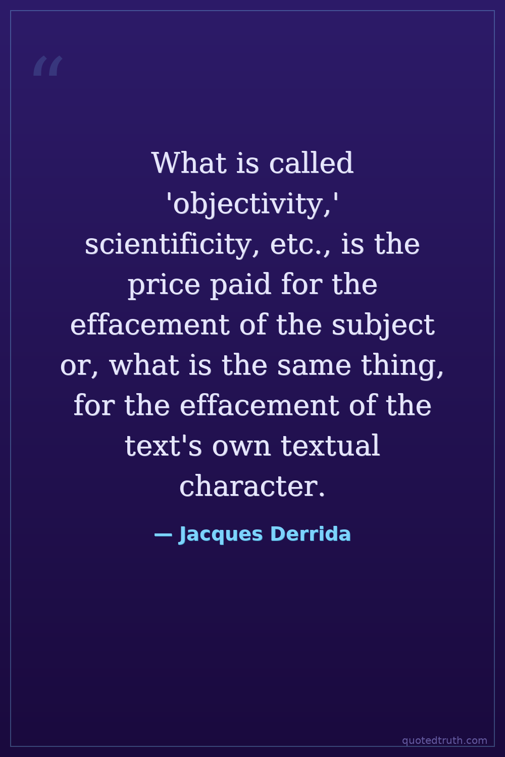 What is called 'objectivity,' scientificity, etc., is the price paid for the effacement of the subject or, what is the same thing, for the effacement of the text's own textual character.