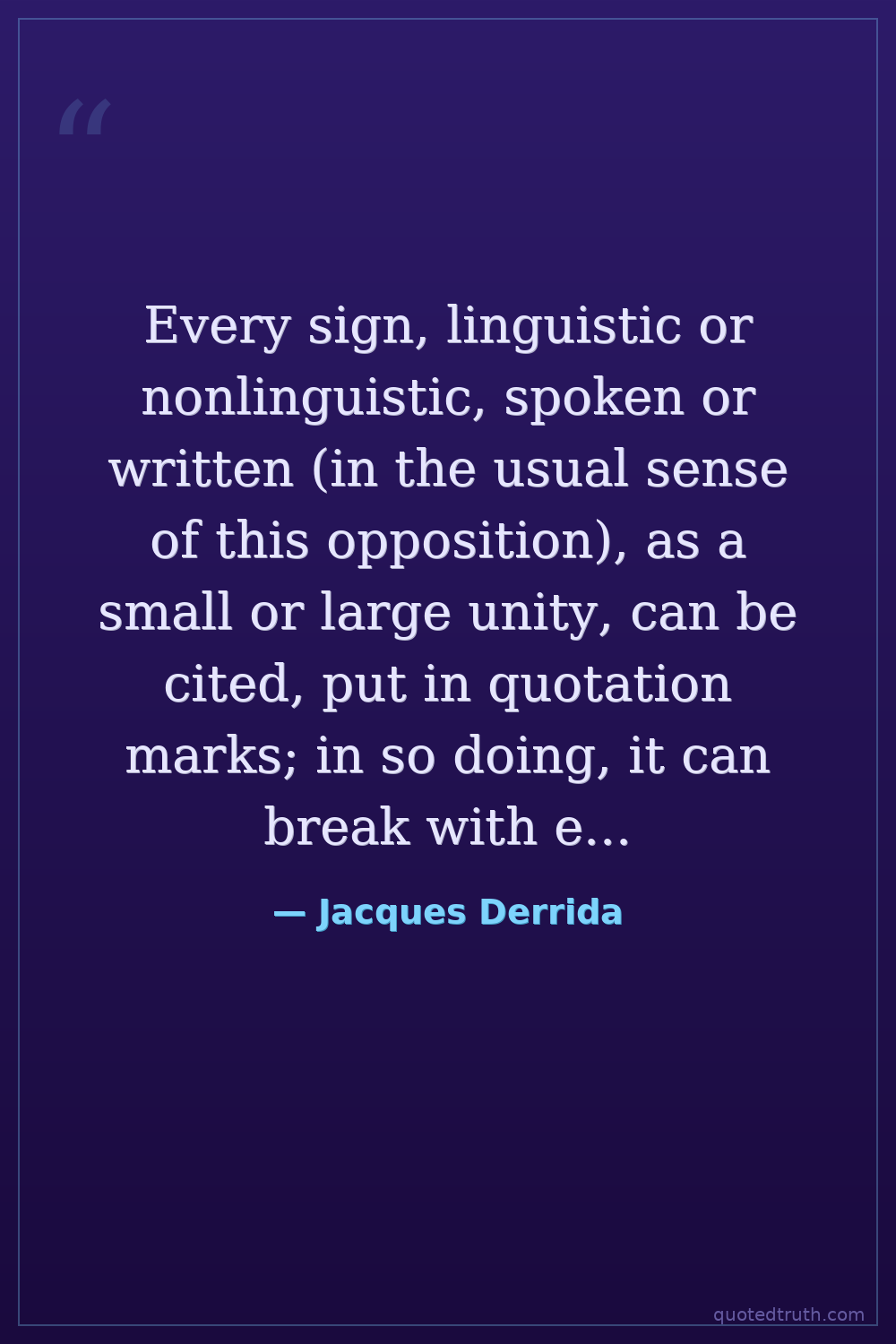 Every sign, linguistic or nonlinguistic, spoken or written (in the usual sense of this opposition), as a small or large unity, can be cited, put in quotation marks; in so doing, it can break with every given context, engendering an infinity of new contexts in a manner which is absolutely illimitable.