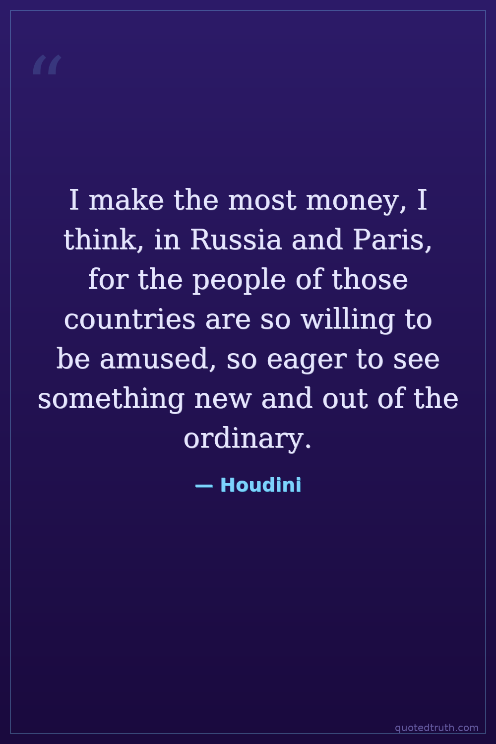 I make the most money, I think, in Russia and Paris, for the people of those countries are so willing to be amused, so eager to see something new and out of the ordinary.