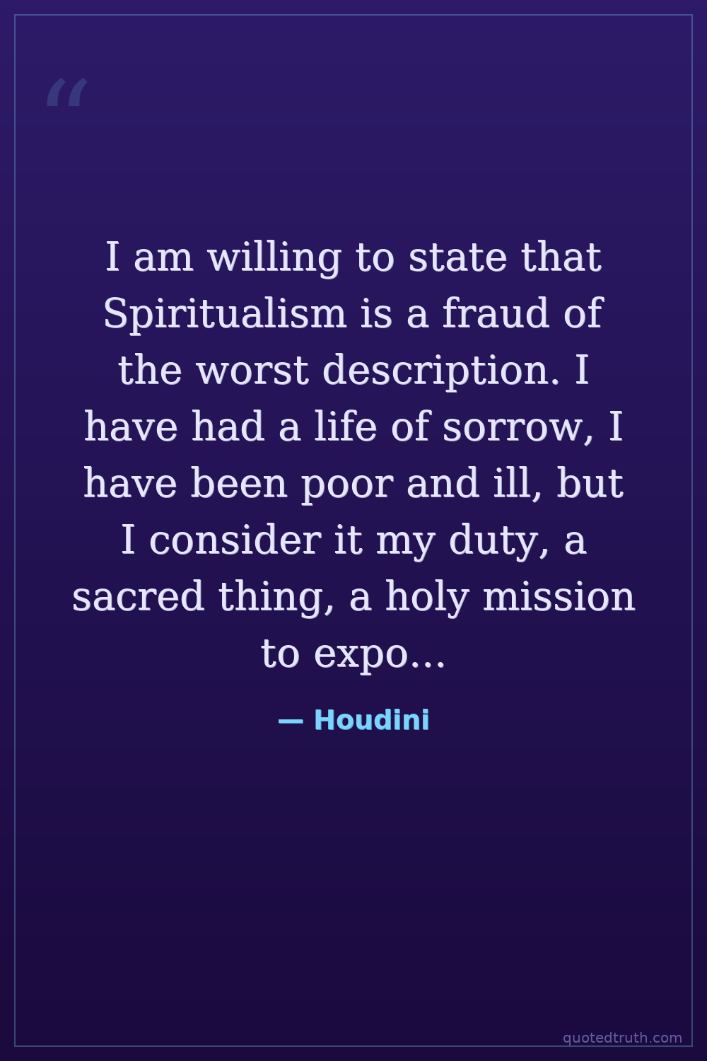 I am willing to state that Spiritualism is a fraud of the worst description. I have had a life of sorrow, I have been poor and ill, but I consider it my duty, a sacred thing, a holy mission to expose it.