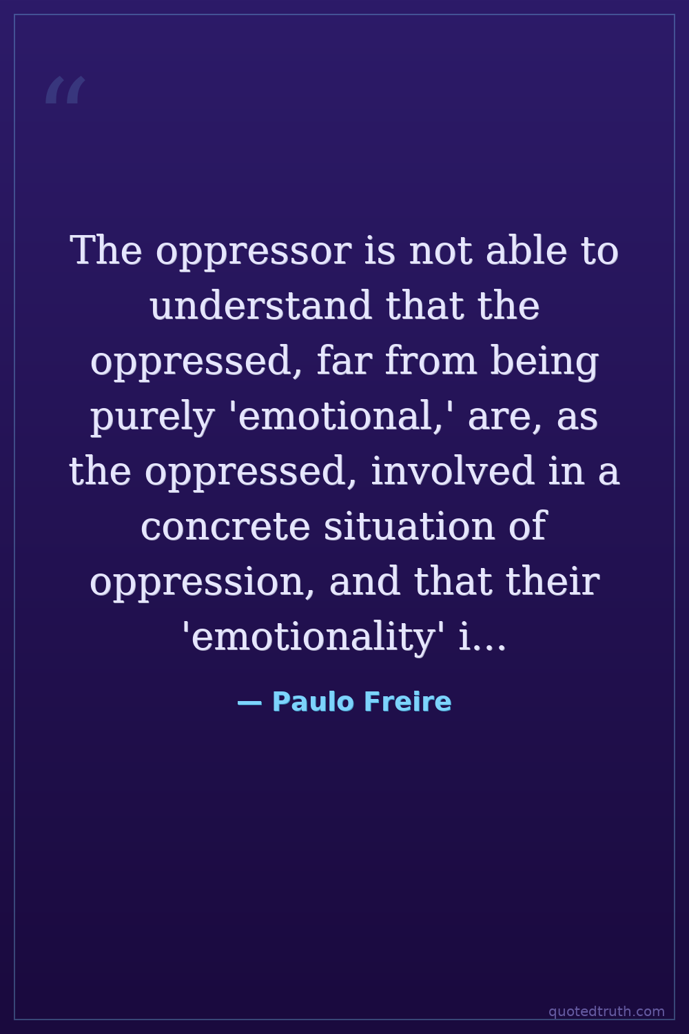 The oppressor is not able to understand that the oppressed, far from being purely 'emotional,' are, as the oppressed, involved in a concrete situation of oppression, and that their 'emotionality' is not a pathological state but the result of the historical and sociological conditions in which they are immersed.