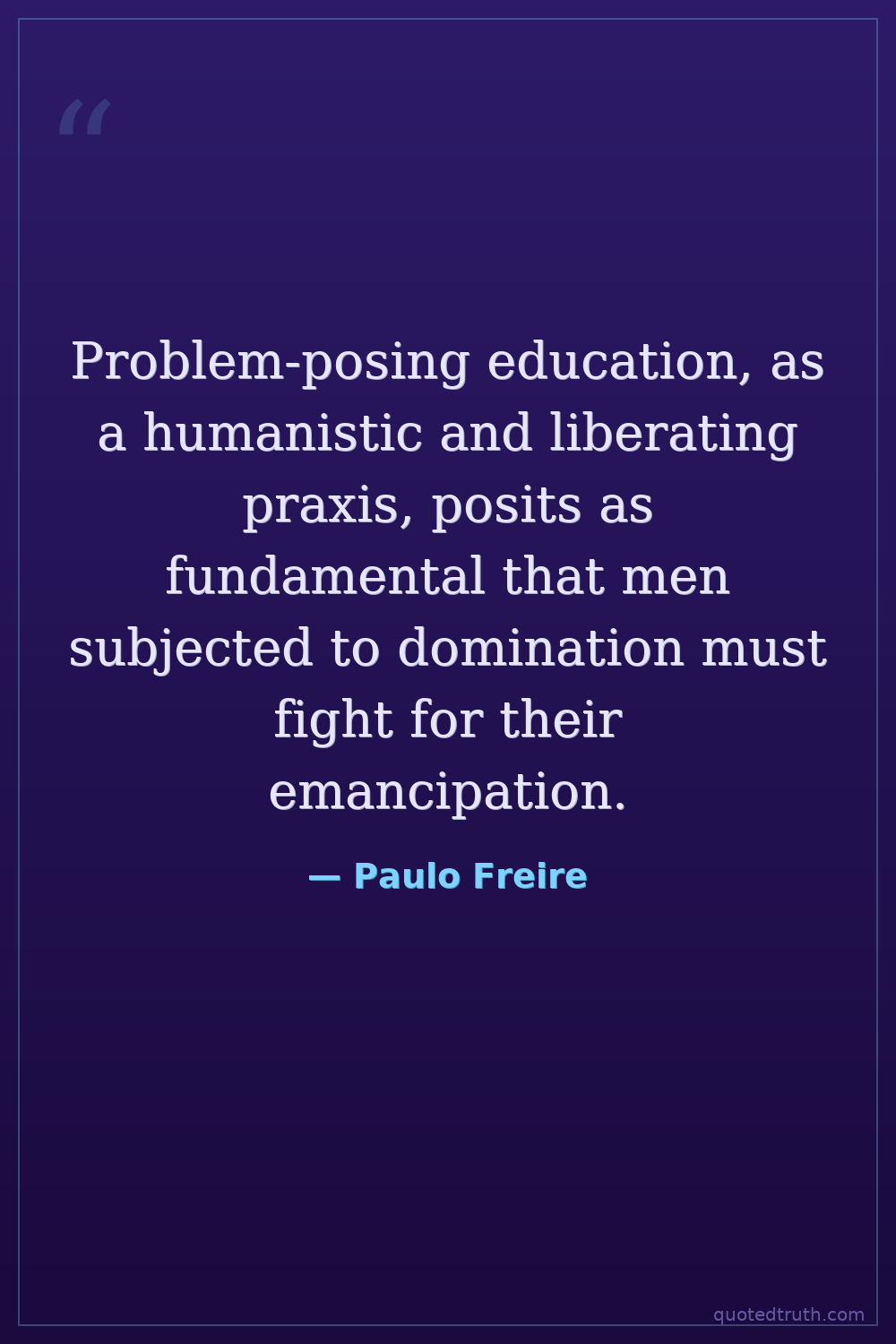 Problem-posing education, as a humanistic and liberating praxis, posits as fundamental that men subjected to domination must fight for their emancipation.