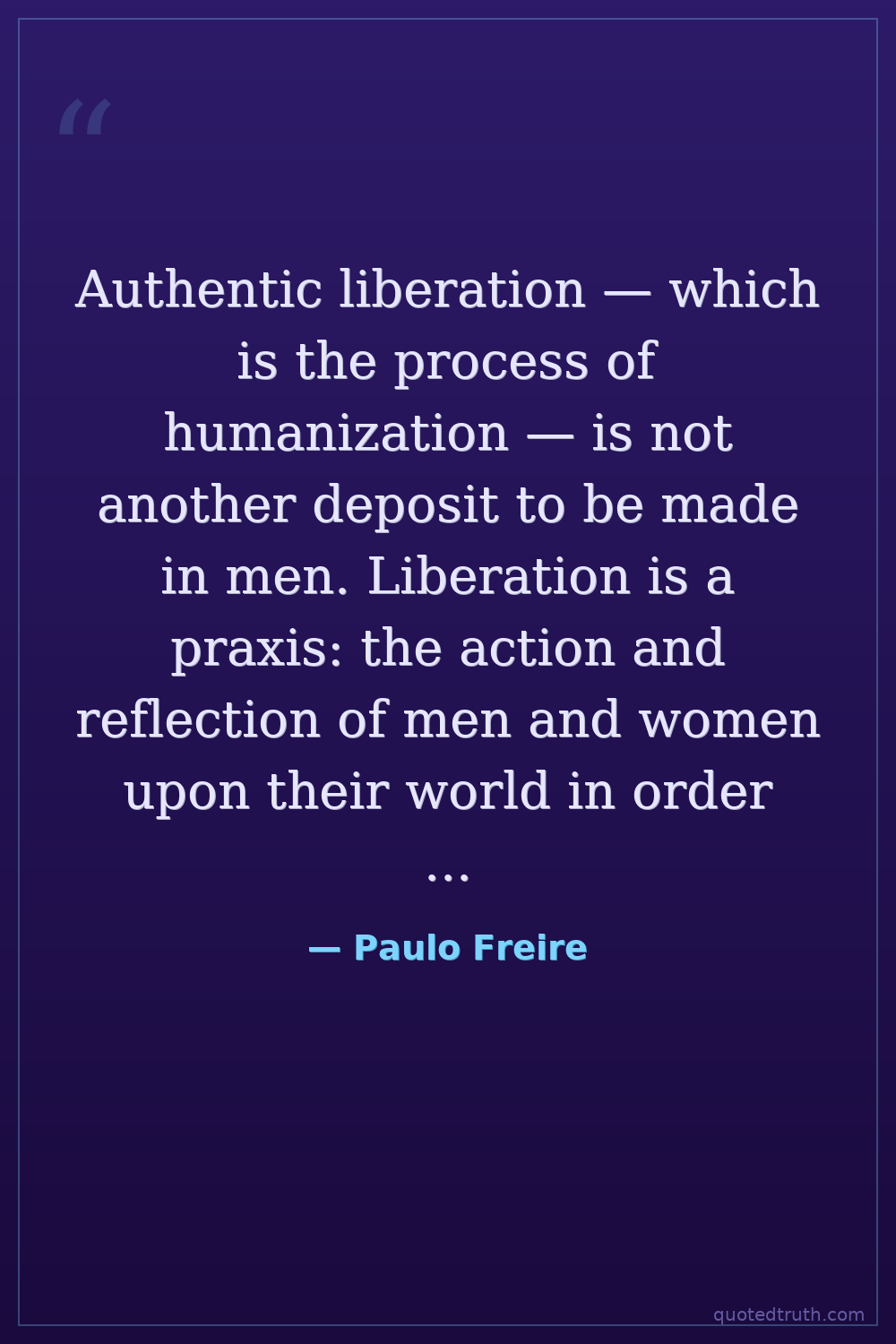 Authentic liberation — which is the process of humanization — is not another deposit to be made in men. Liberation is a praxis: the action and reflection of men and women upon their world in order to transform it.