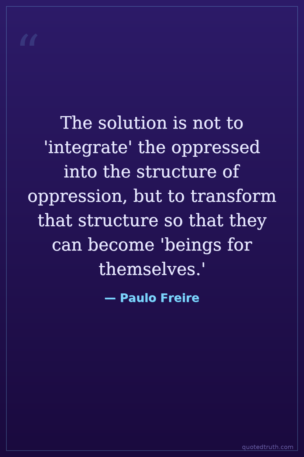 The solution is not to 'integrate' the oppressed into the structure of oppression, but to transform that structure so that they can become 'beings for themselves.'