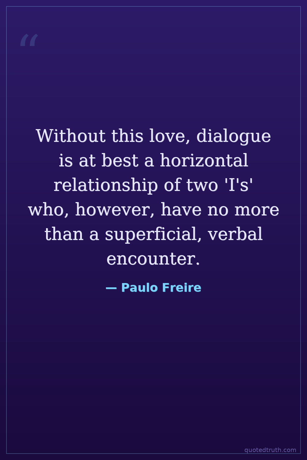 Without this love, dialogue is at best a horizontal relationship of two 'I's' who, however, have no more than a superficial, verbal encounter.