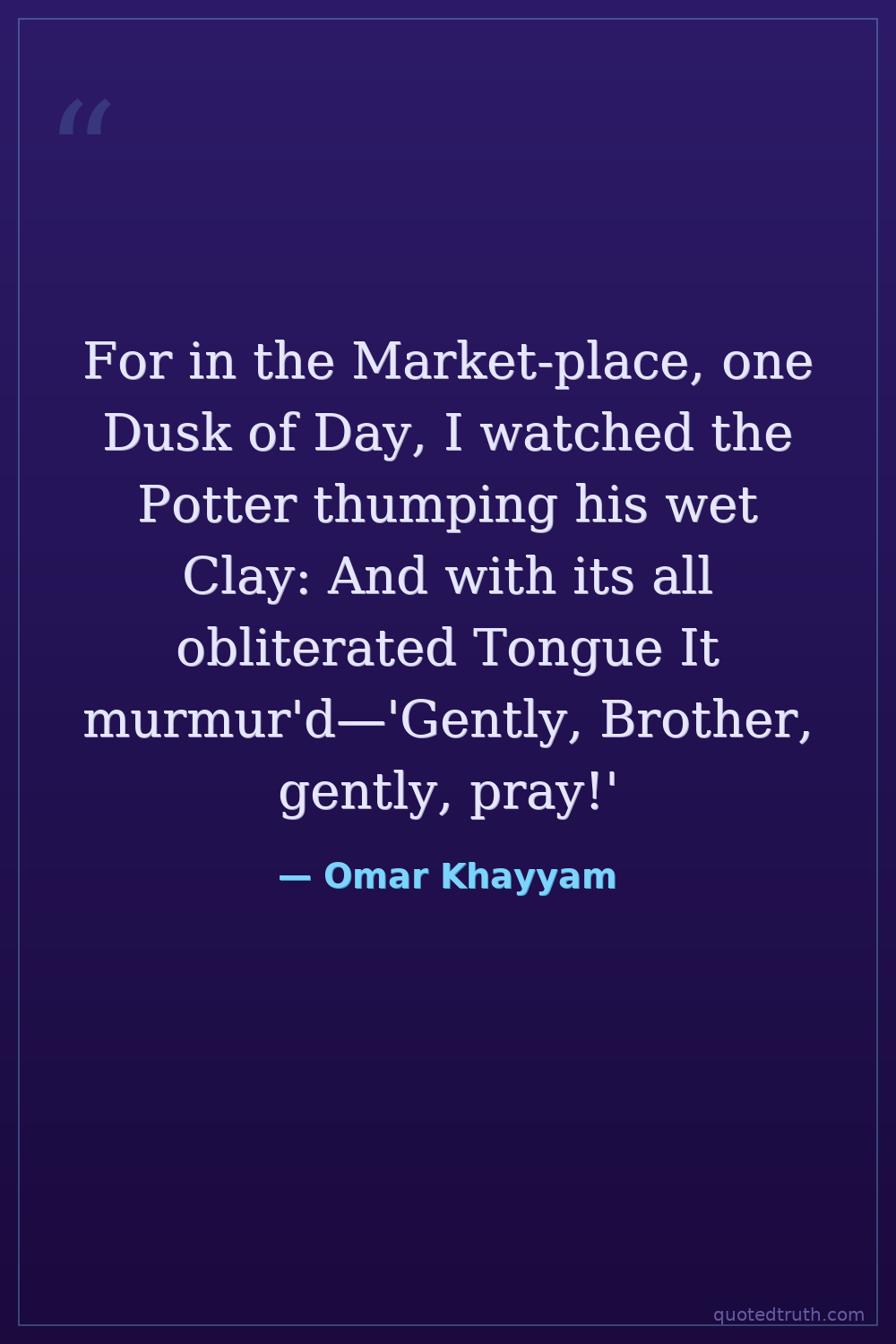 For in the Market-place, one Dusk of Day, I watched the Potter thumping his wet Clay: And with its all obliterated Tongue It murmur'd—'Gently, Brother, gently, pray!'