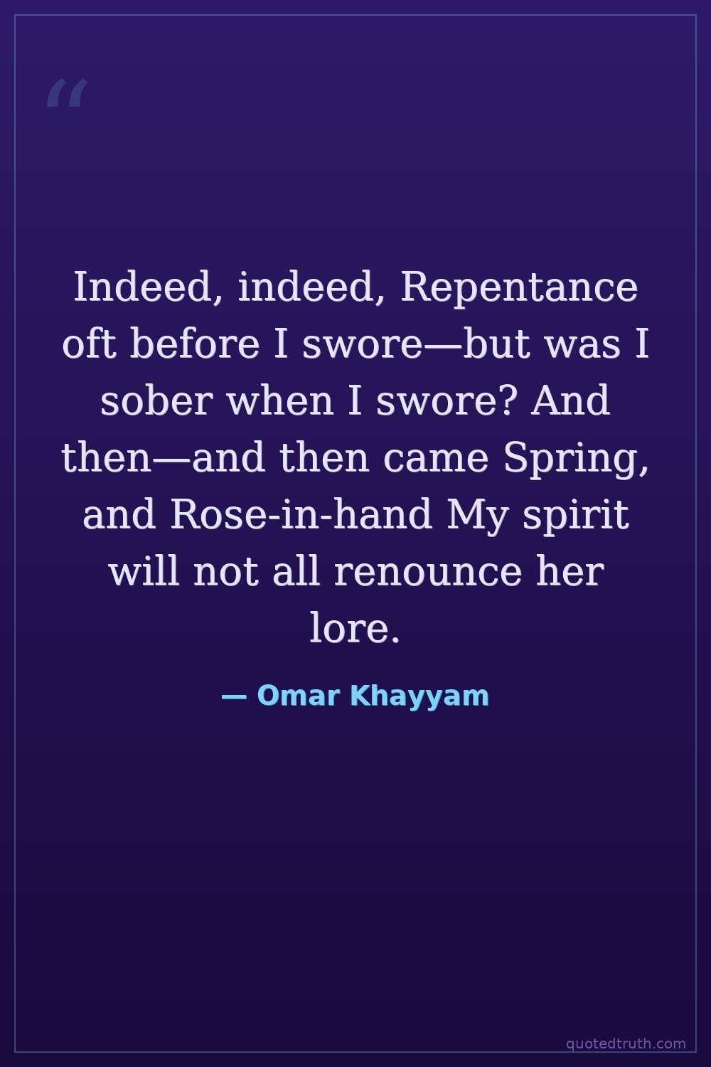 Indeed, indeed, Repentance oft before I swore—but was I sober when I swore? And then—and then came Spring, and Rose-in-hand My spirit will not all renounce her lore.
