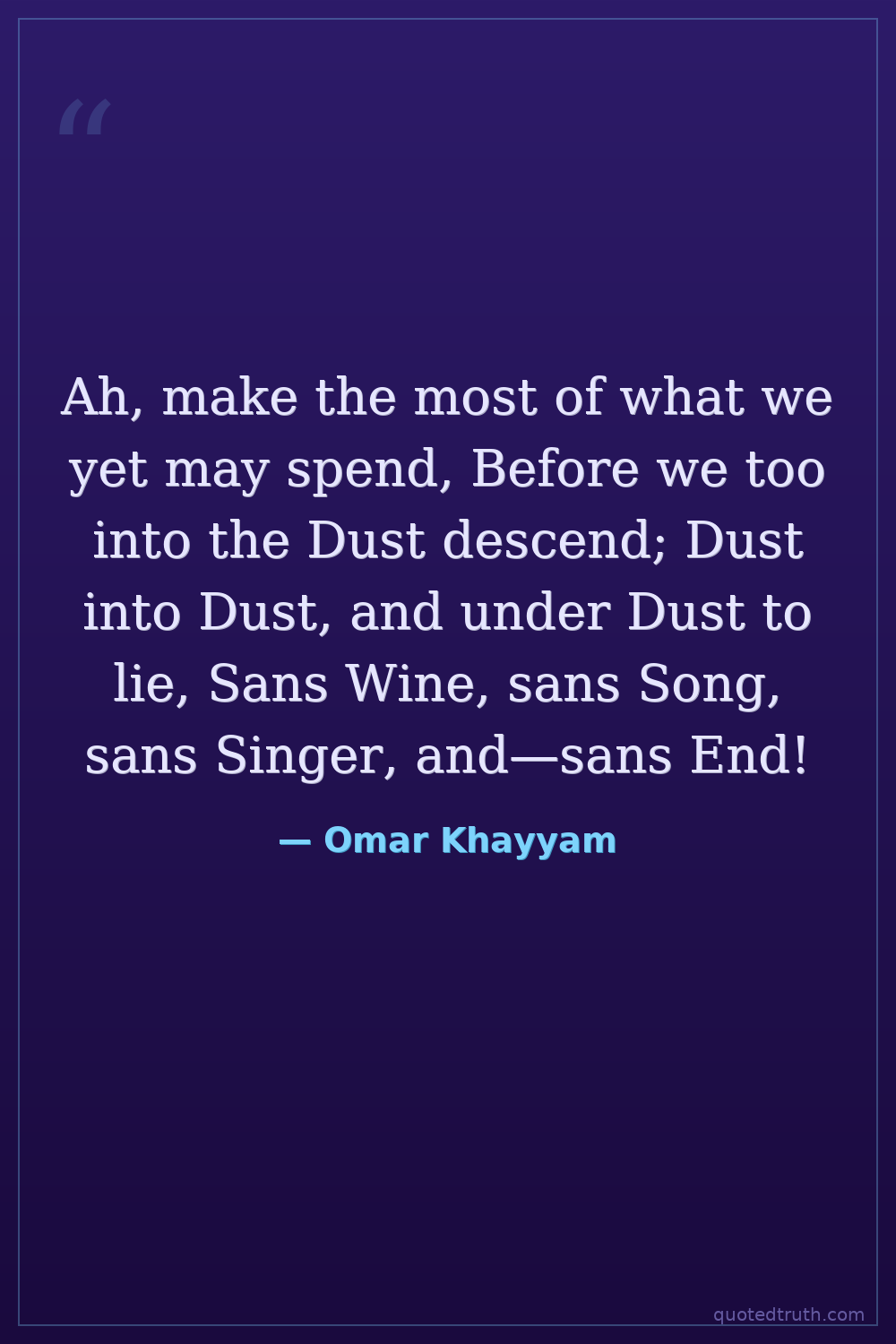 Ah, make the most of what we yet may spend, Before we too into the Dust descend; Dust into Dust, and under Dust to lie, Sans Wine, sans Song, sans Singer, and—sans End!
