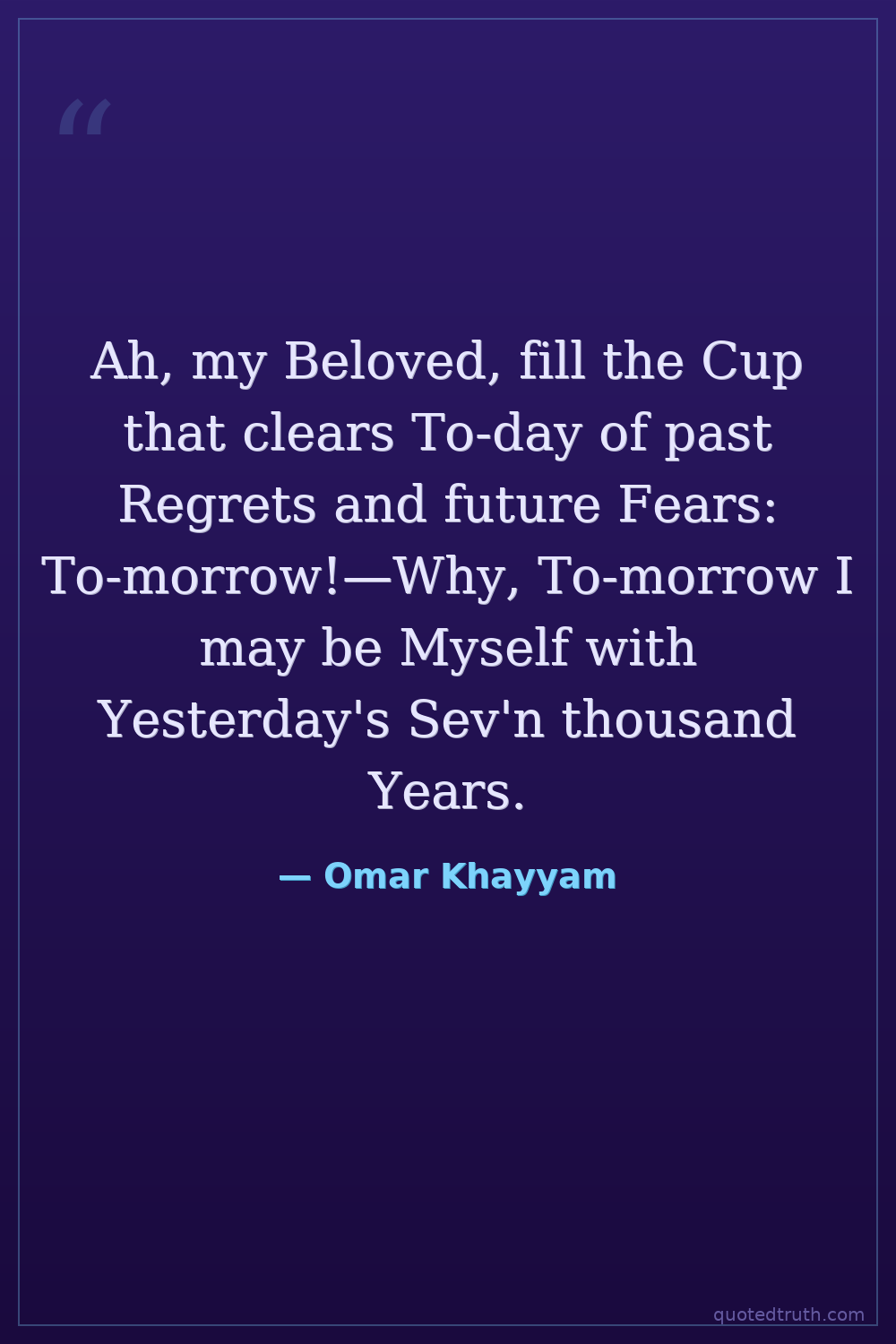 Ah, my Beloved, fill the Cup that clears To-day of past Regrets and future Fears: To-morrow!—Why, To-morrow I may be Myself with Yesterday's Sev'n thousand Years.