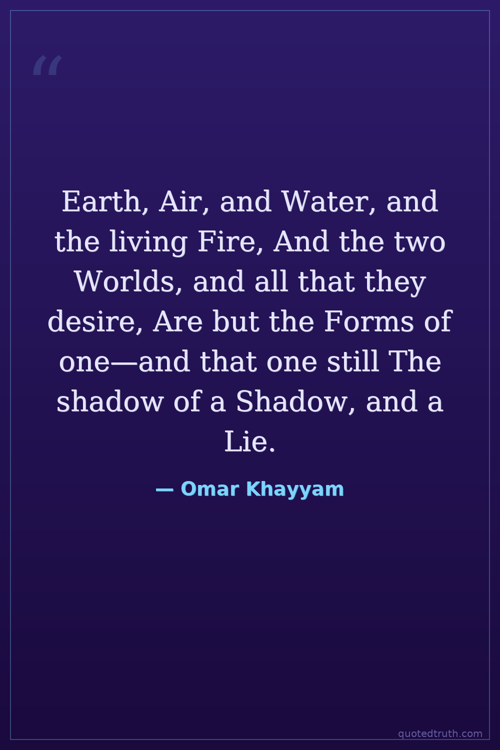Earth, Air, and Water, and the living Fire, And the two Worlds, and all that they desire, Are but the Forms of one—and that one still The shadow of a Shadow, and a Lie.