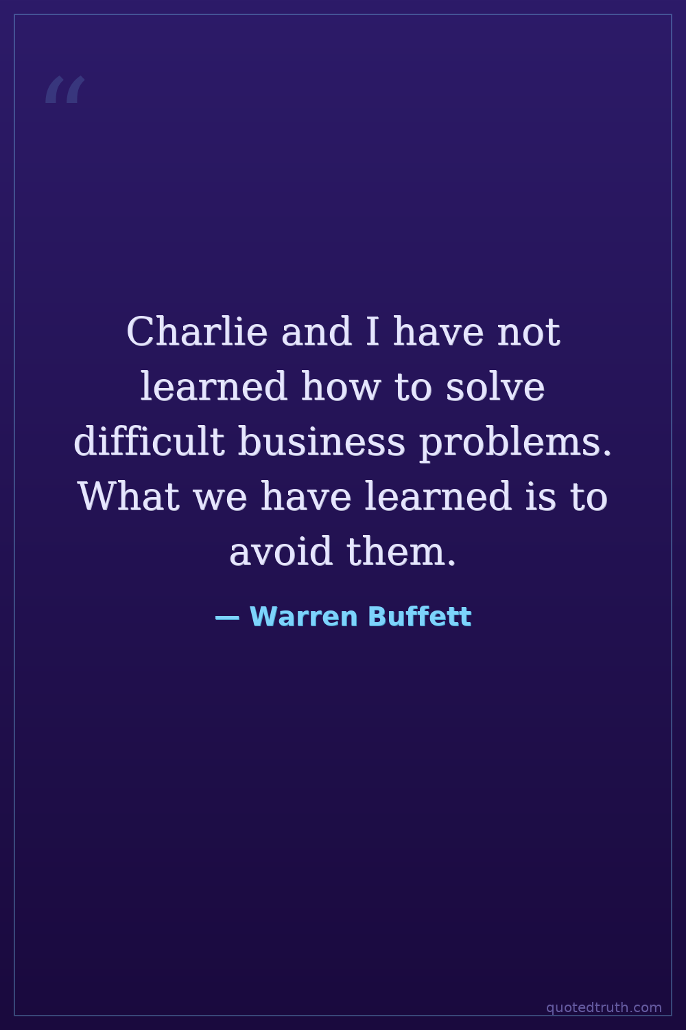 Charlie and I have not learned how to solve difficult business problems. What we have learned is to avoid them.