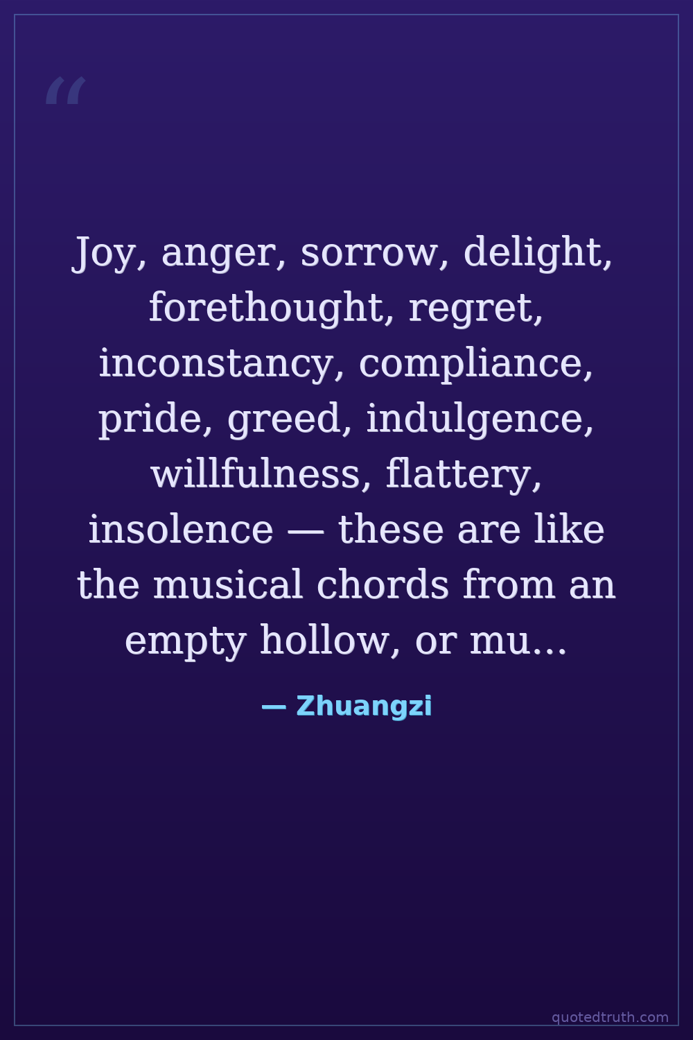 Joy, anger, sorrow, delight, forethought, regret, inconstancy, compliance, pride, greed, indulgence, willfulness, flattery, insolence — these are like the musical chords from an empty hollow, or mushrooms in damp places. They keep alternating and changing, day and night, but no one knows what they spring from. Let it be! Let it be! How can we find the source of their beginning?