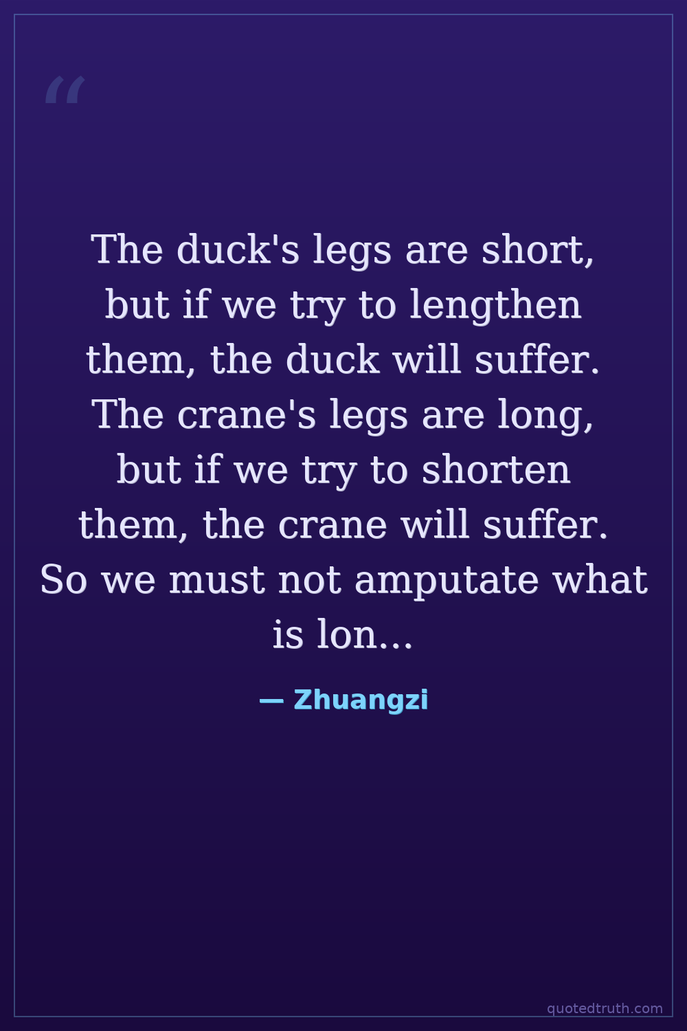 The duck's legs are short, but if we try to lengthen them, the duck will suffer. The crane's legs are long, but if we try to shorten them, the crane will suffer. So we must not amputate what is long, nor lengthen what is short. What is natural is not to be tampered with.