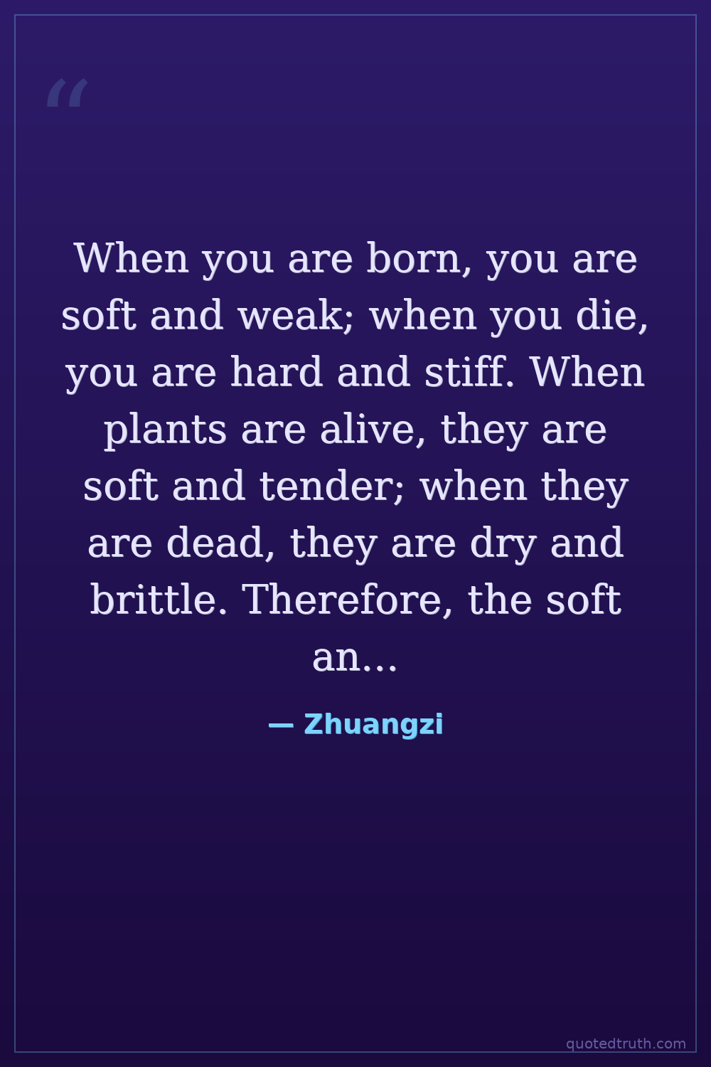 When you are born, you are soft and weak; when you die, you are hard and stiff. When plants are alive, they are soft and tender; when they are dead, they are dry and brittle. Therefore, the soft and weak are the companions of life; the hard and stiff are the companions of death.