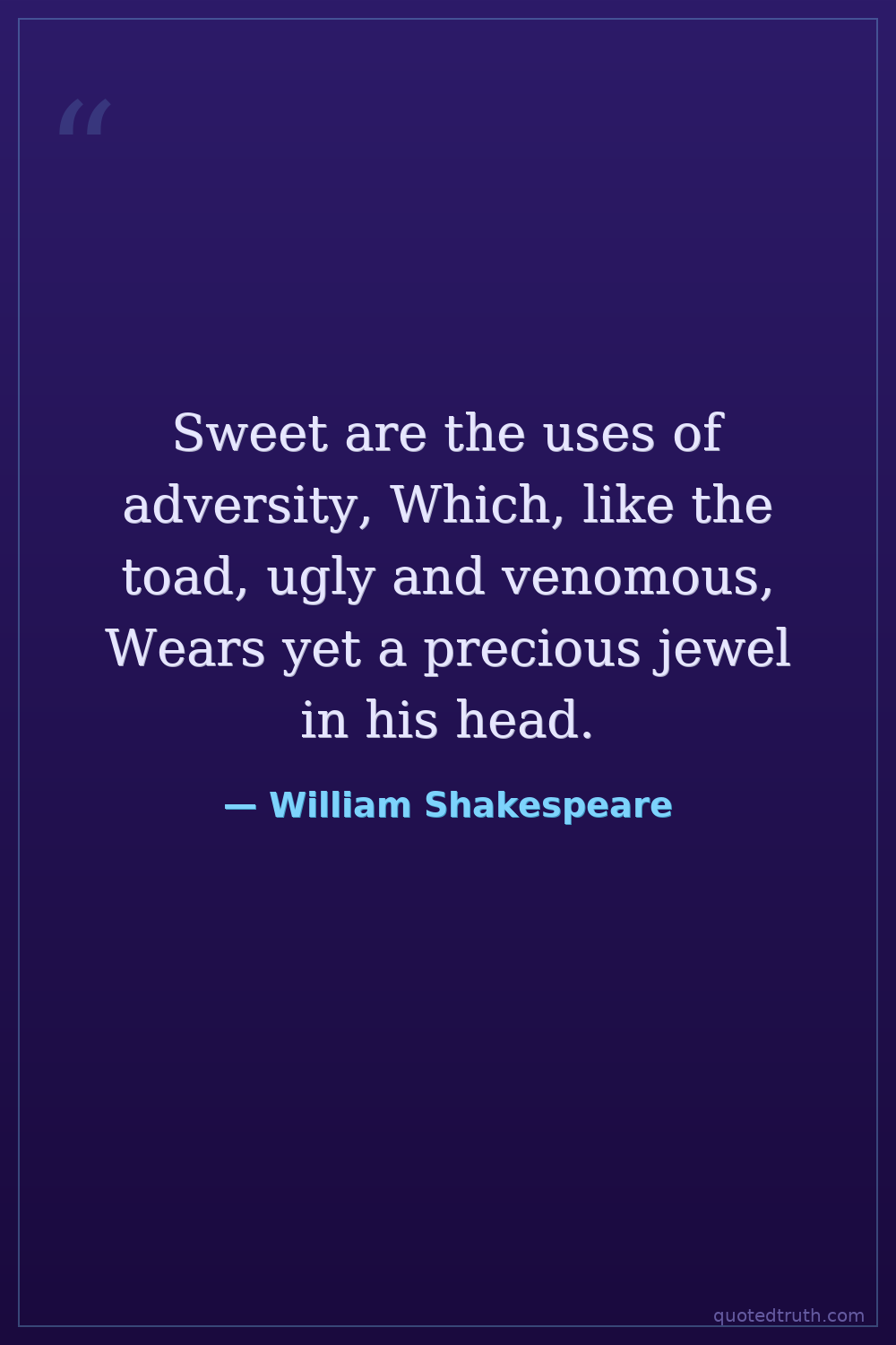 Sweet are the uses of adversity, Which, like the toad, ugly and venomous, Wears yet a precious jewel in his head.