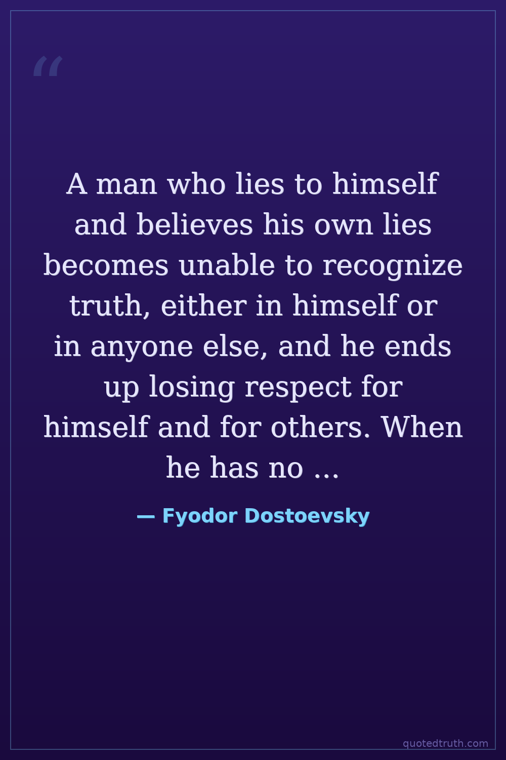 A man who lies to himself and believes his own lies becomes unable to recognize truth, either in himself or in anyone else, and he ends up losing respect for himself and for others. When he has no respect for anyone, he can no longer love, and in order to divert himself, having no love in him, he gives way to passions and coarse pleasures, and sinks to bestiality in his vices, all from continual lying to other people and to himself.