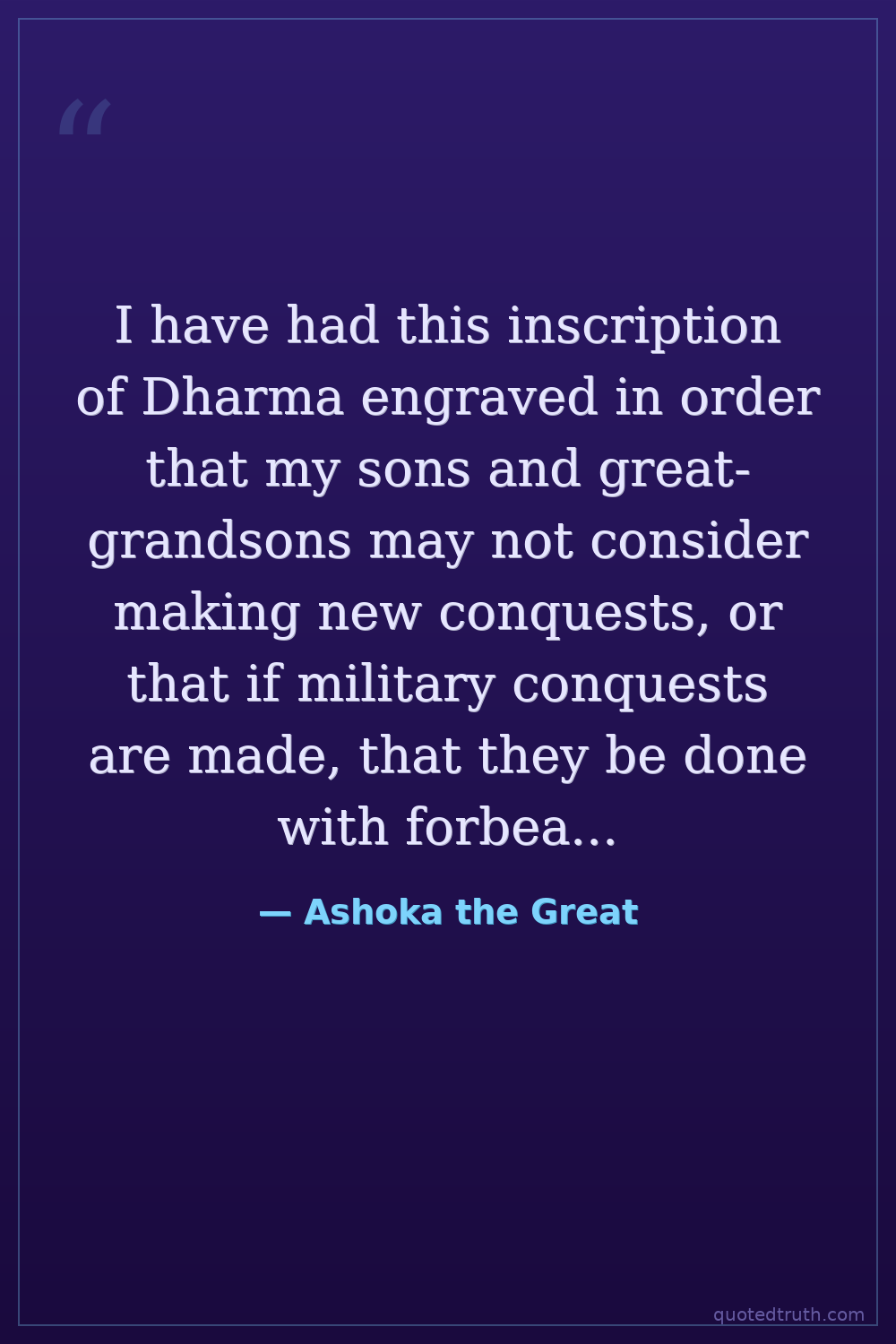 I have had this inscription of Dharma engraved in order that my sons and great-grandsons may not consider making new conquests, or that if military conquests are made, that they be done with forbearance and light punishment, or better still, that they consider making conquest by Dharma only, for that bears fruit in this world and the next.