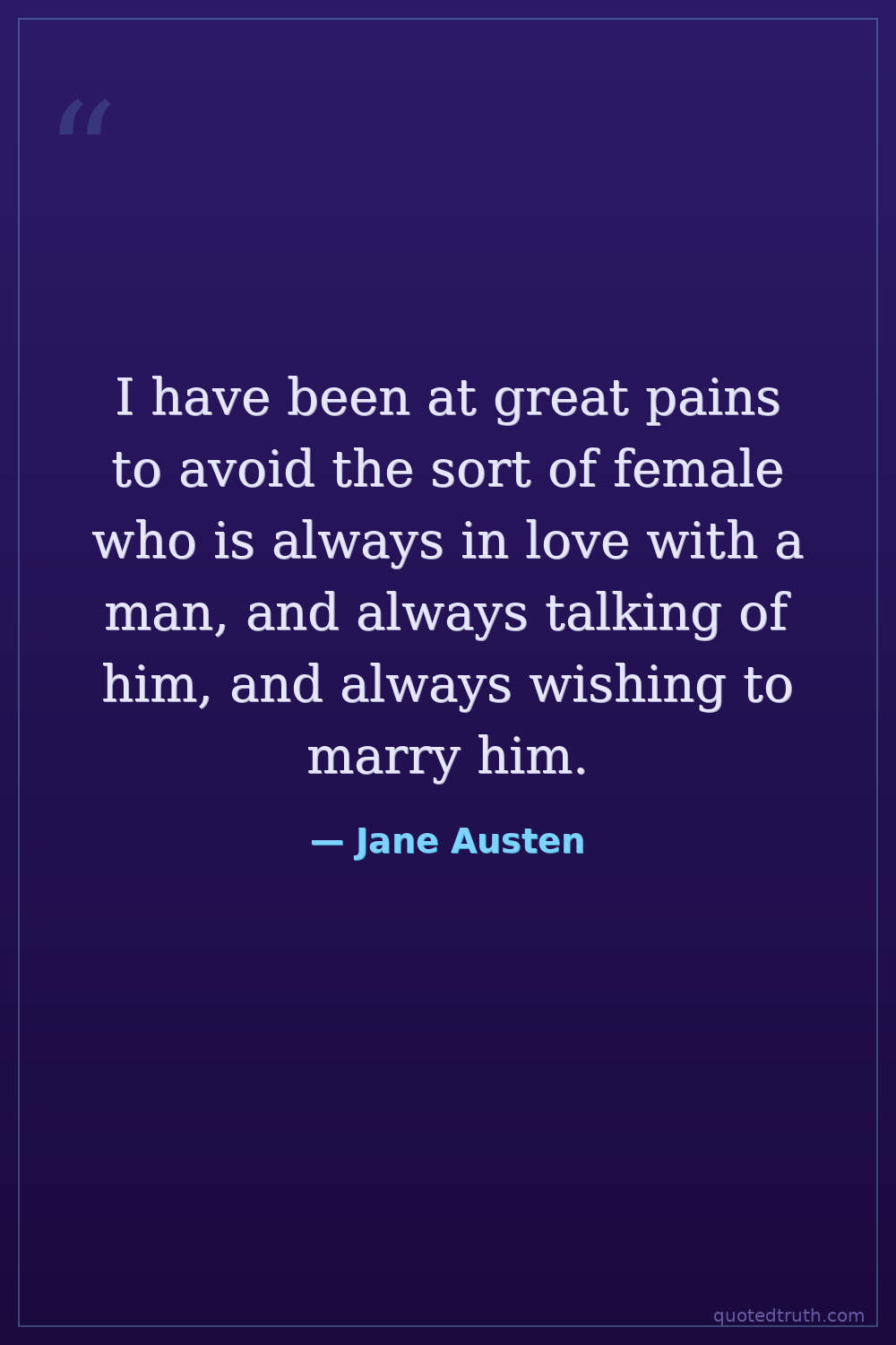 I have been at great pains to avoid the sort of female who is always in love with a man, and always talking of him, and always wishing to marry him.