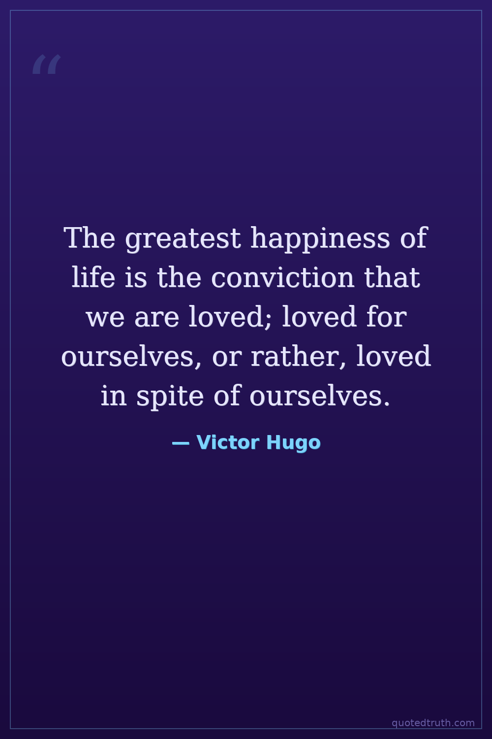 The greatest happiness of life is the conviction that we are loved; loved for ourselves, or rather, loved in spite of ourselves.