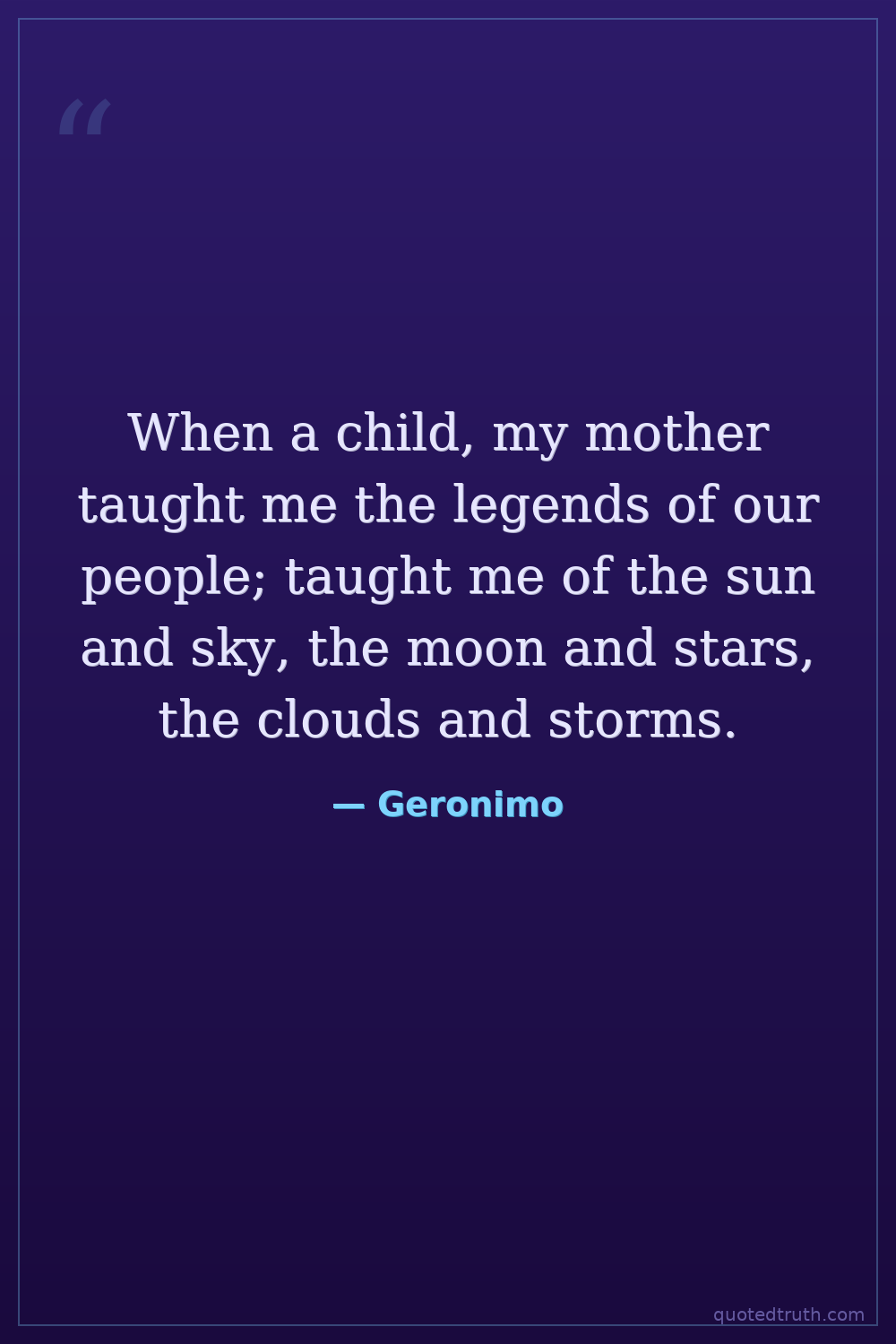 When a child, my mother taught me the legends of our people; taught me of the sun and sky, the moon and stars, the clouds and storms.