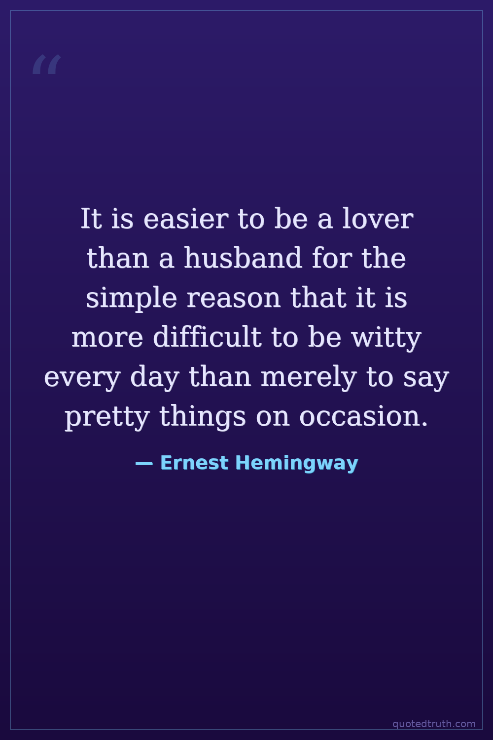 It is easier to be a lover than a husband for the simple reason that it is more difficult to be witty every day than merely to say pretty things on occasion.