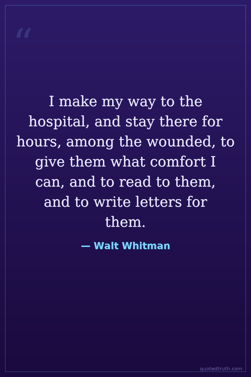 I make my way to the hospital, and stay there for hours, among the wounded, to give them what comfort I can, and to read to them, and to write letters for them.