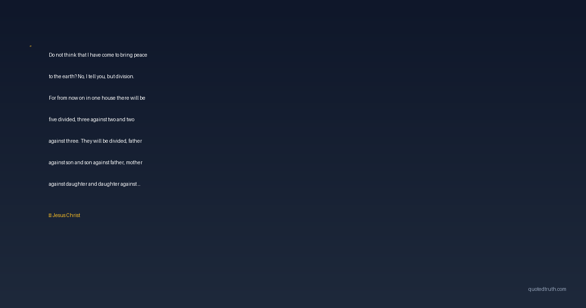 Do not think that I have come to bring peace to the earth? No, I tell you, but division. For from now on in one house there will be five divided, three against two and two against three. They will be divided, father against son and son against father, mother against daughter and daughter against mother, mother-in-law against her daughter-in-law and daughter-in-law against mother-in-law.