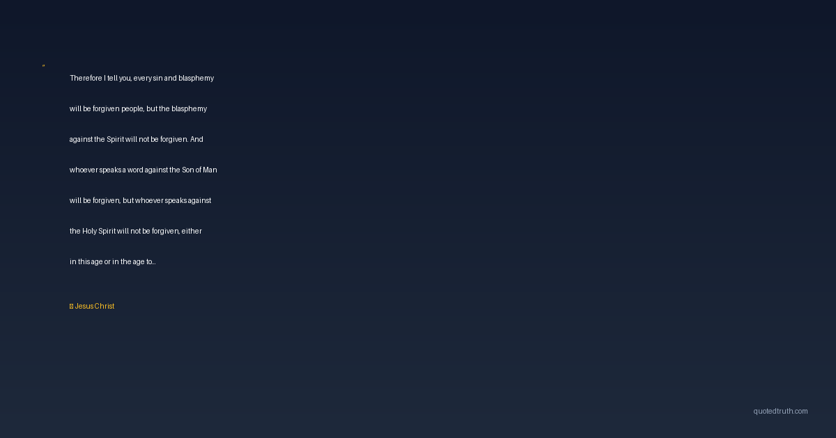 Therefore I tell you, every sin and blasphemy will be forgiven people, but the blasphemy against the Spirit will not be forgiven. And whoever speaks a word against the Son of Man will be forgiven, but whoever speaks against the Holy Spirit will not be forgiven, either in this age or in the age to come.