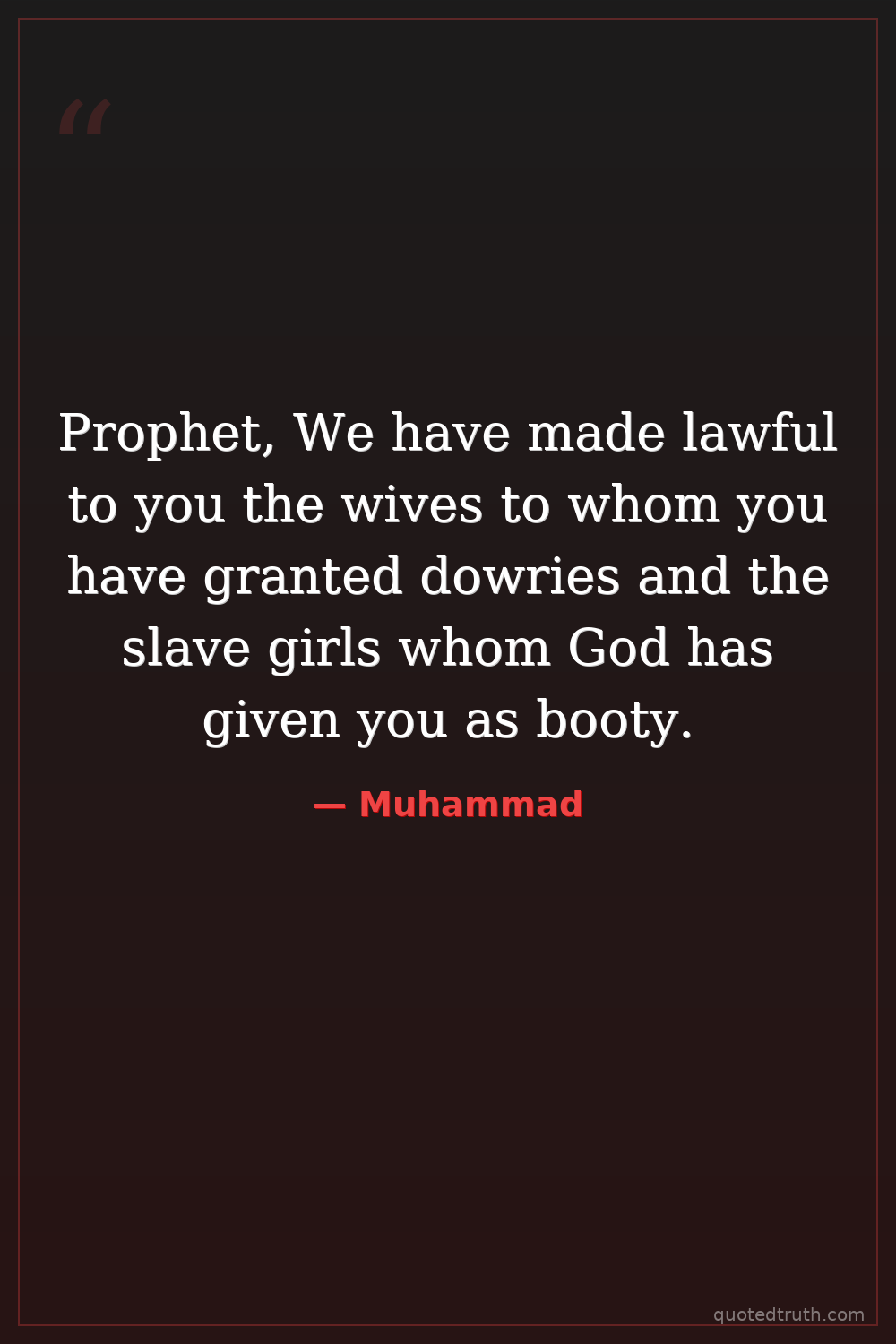 Prophet, We have made lawful to you the wives to whom you have granted dowries and the slave girls whom God has given you as booty.