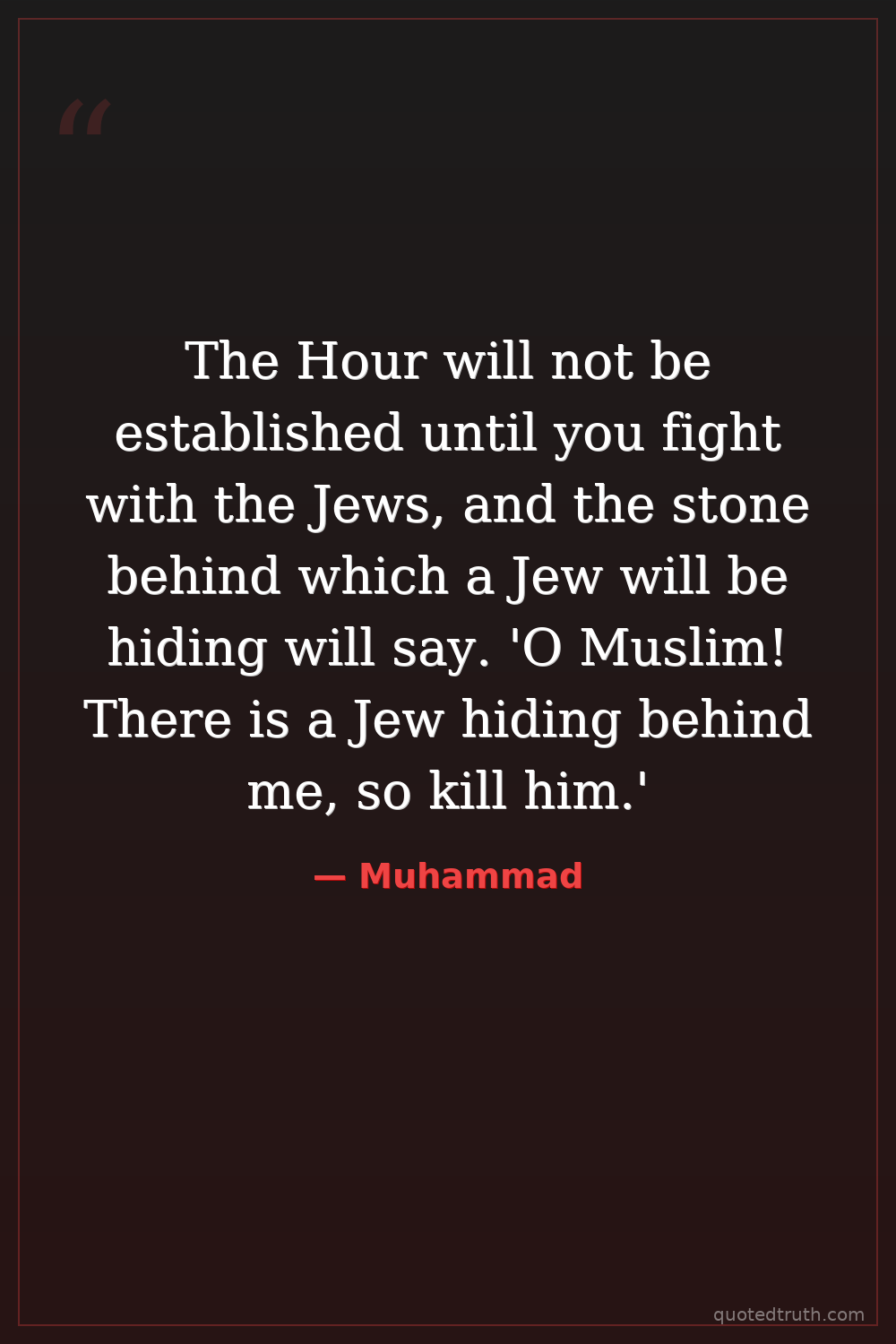 The Hour will not be established until you fight with the Jews, and the stone behind which a Jew will be hiding will say. 'O Muslim! There is a Jew hiding behind me, so kill him.'